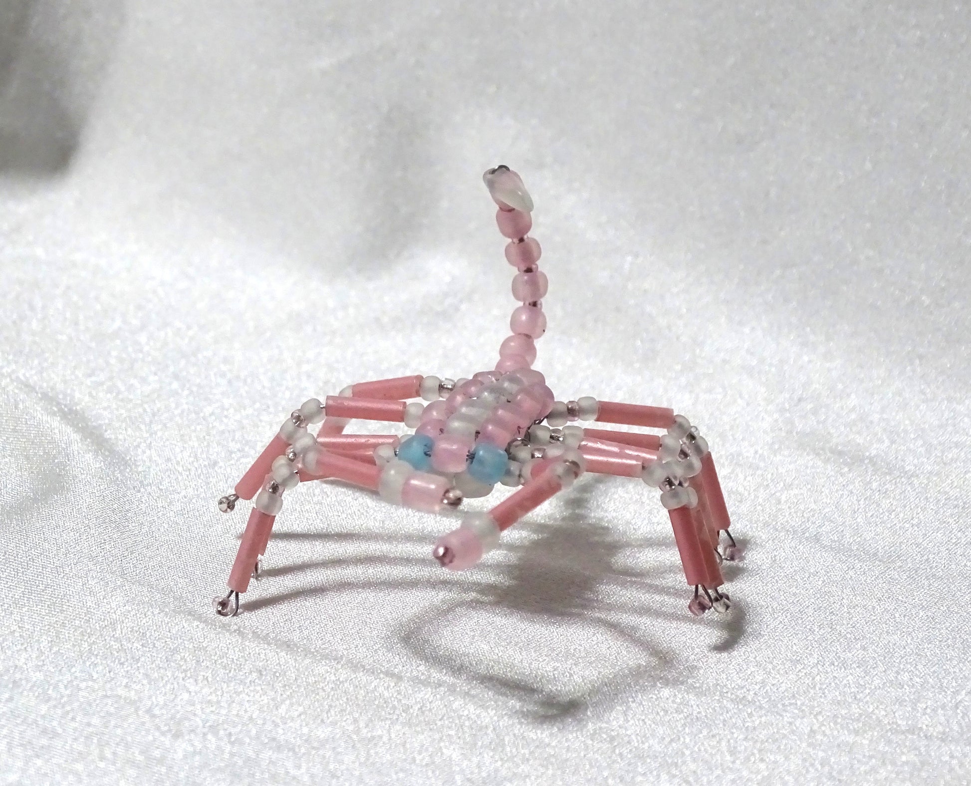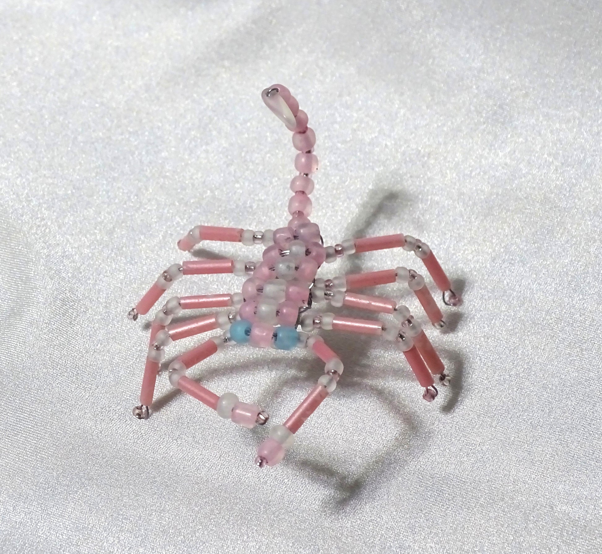 This scorpion is a more fuller-bodied one with soft matte blue eyes and a lot of character. It features soft matte translucent pink and soft matte translucent white that also glows in the dark, and solid pearly pink bugle beads for its legs. It is poseable, however, pose with caution as too much bending could break the wire inside.
