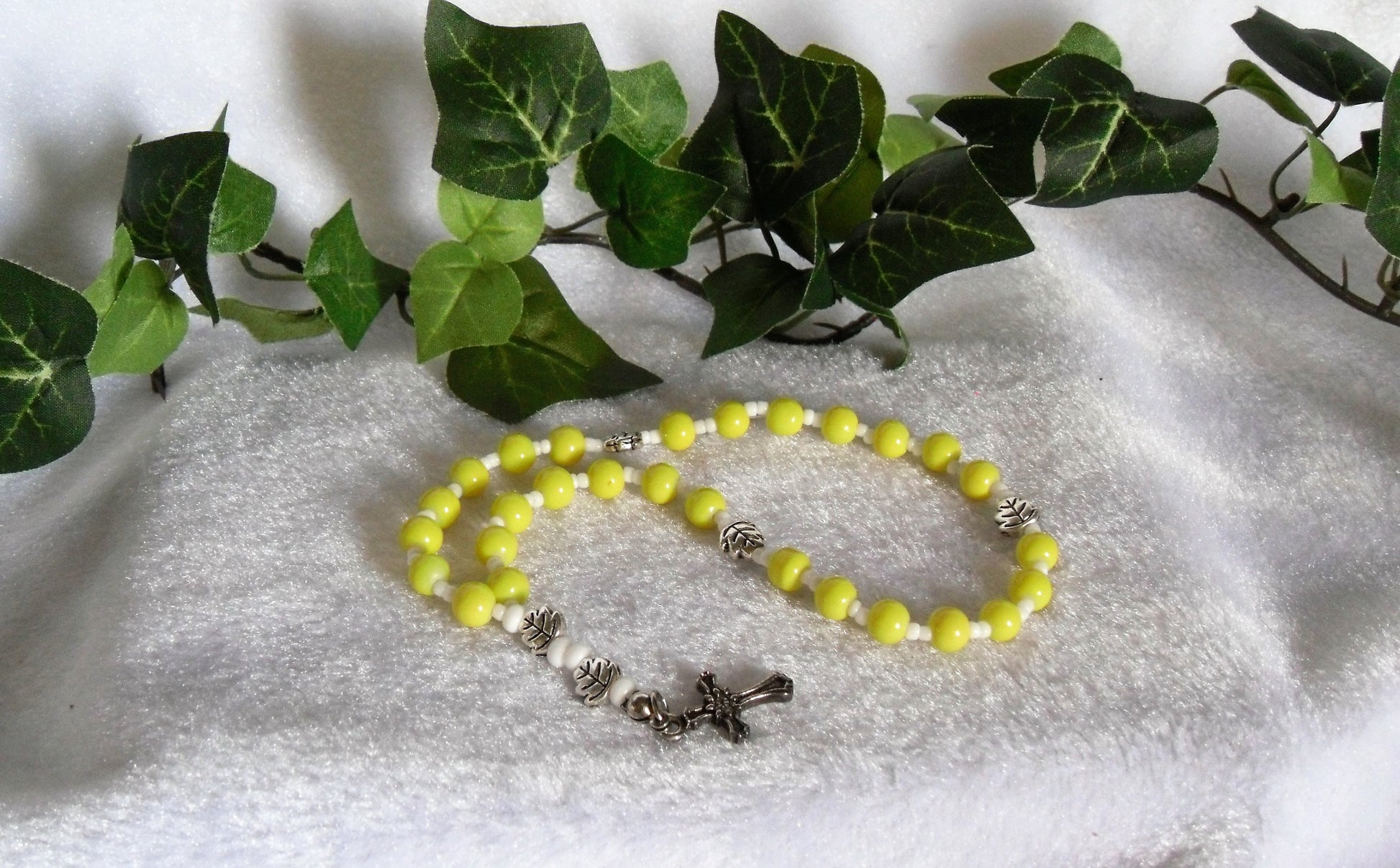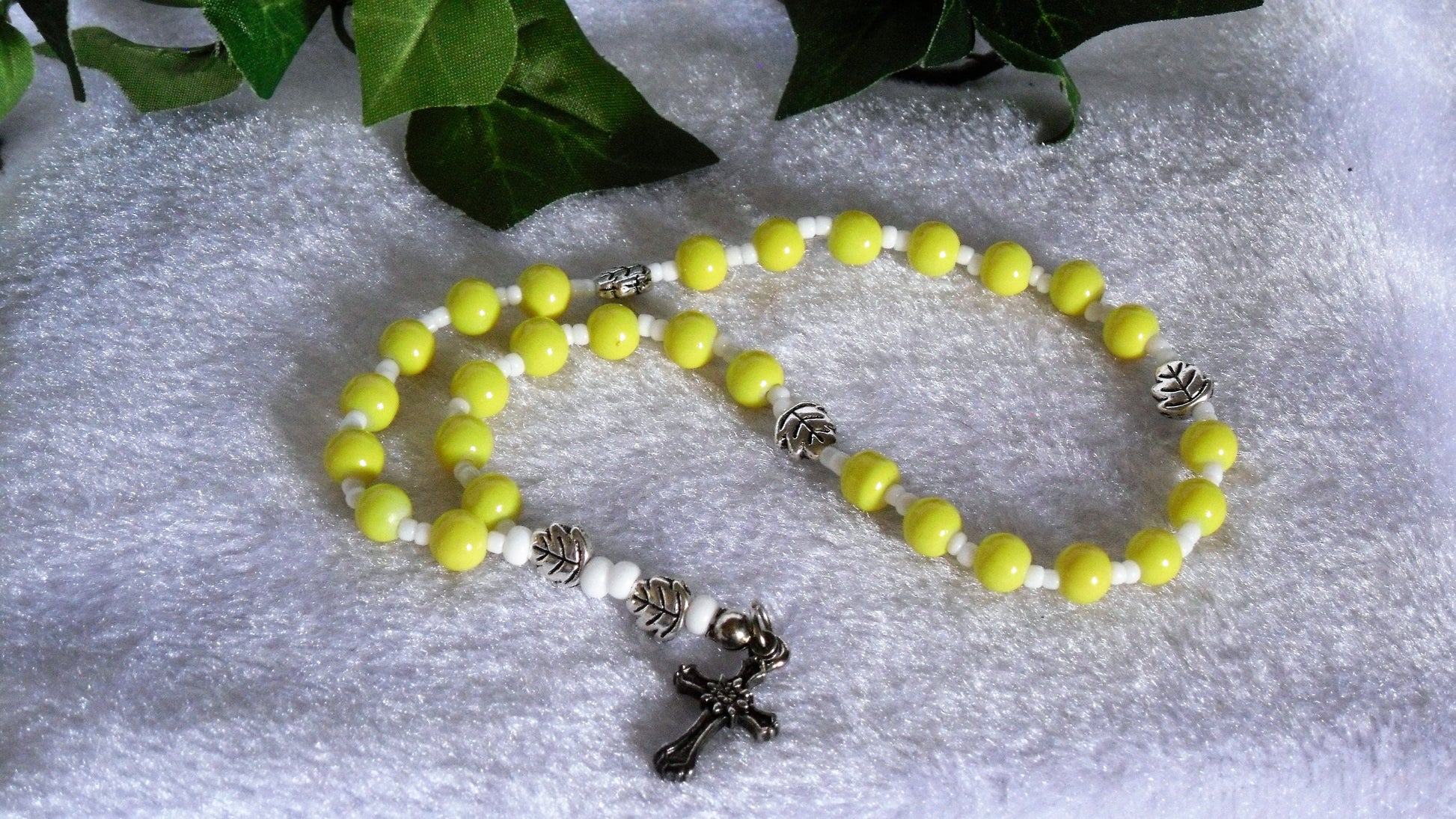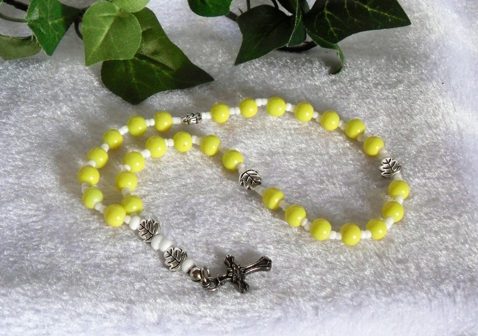 The weeks of this Anglican rosary are a bright, cheery yellow that have been spaced with white glass seed beads to give it a nice movement. Each cruciform is a silver tone metal leaf that accentuates the little silver tone metal crucifix that completes this piece.