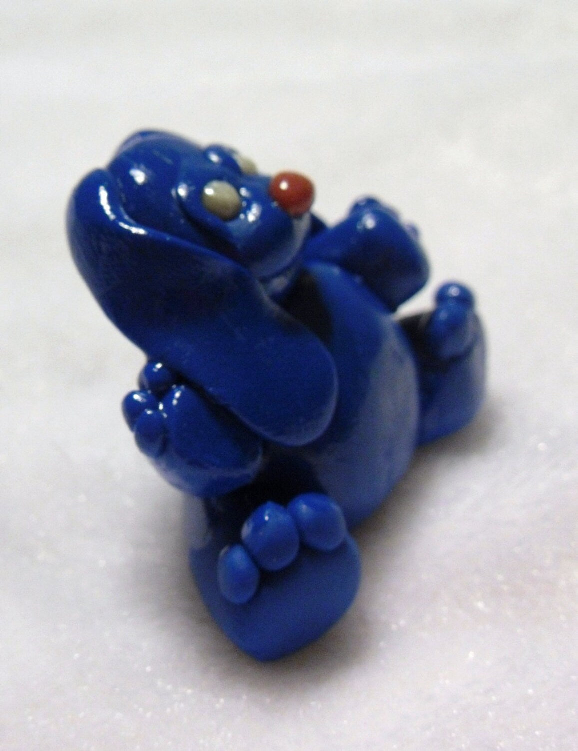 He looks like he's doing "jazz hands" for some reason, telling a joke perhaps, or maybe because he's cobalt blue…or maybe just because he can. Whatever he's doing he's having a great time at it, as evidenced by the grin forming on his face, and he hopes you'll join him and have a great time too. 1 3/8 inches high, 1 5/8 inches wide, 7/8 inch long.