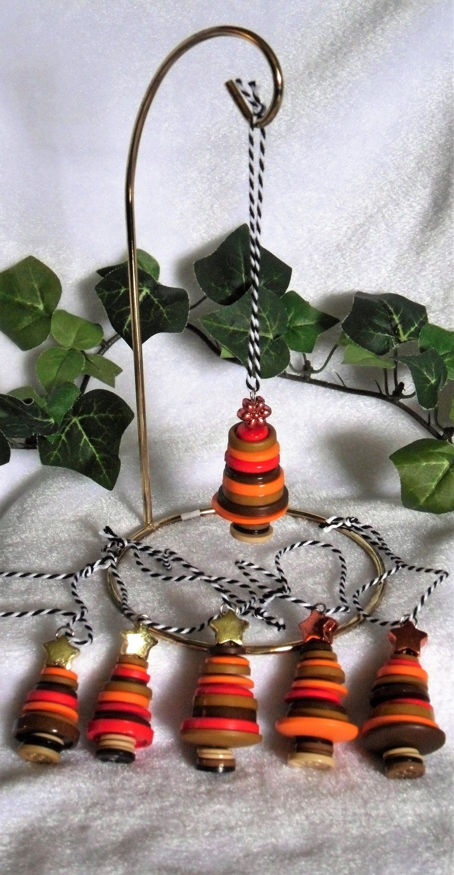 Each ornament is a compilation of multiple colors of buttons stacked into the tree shape and is finished with a coordinating “topper” that adds to the charm.