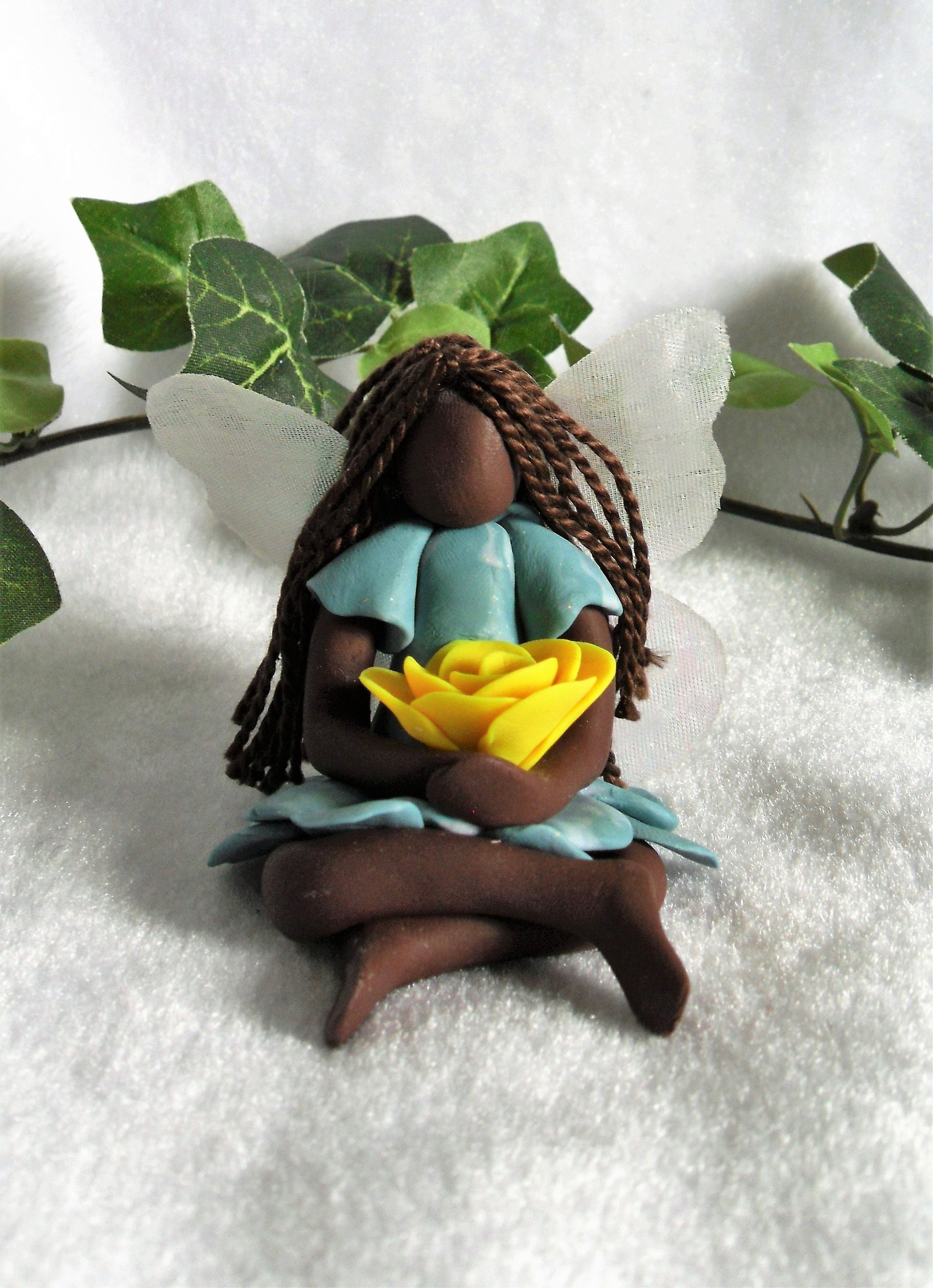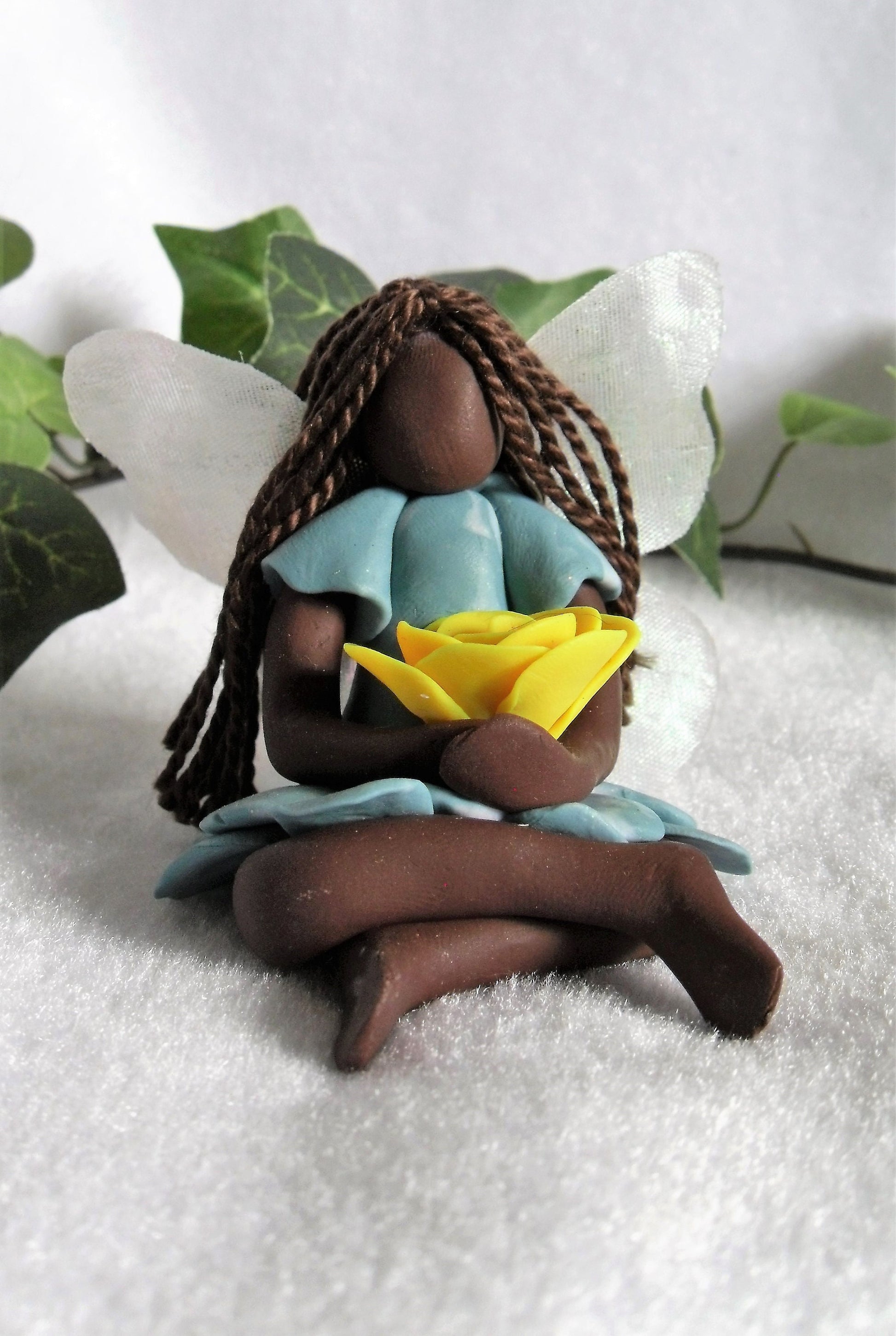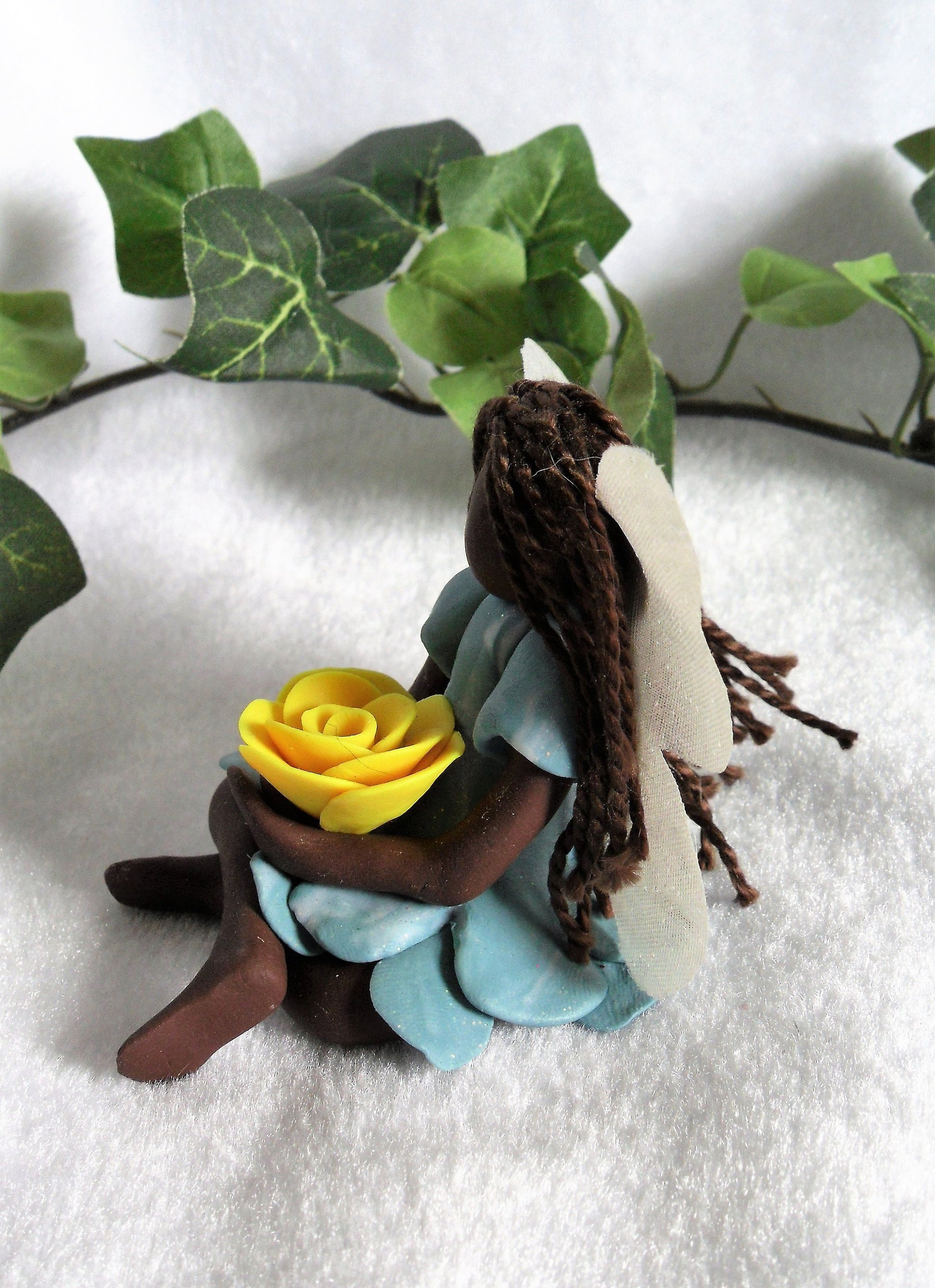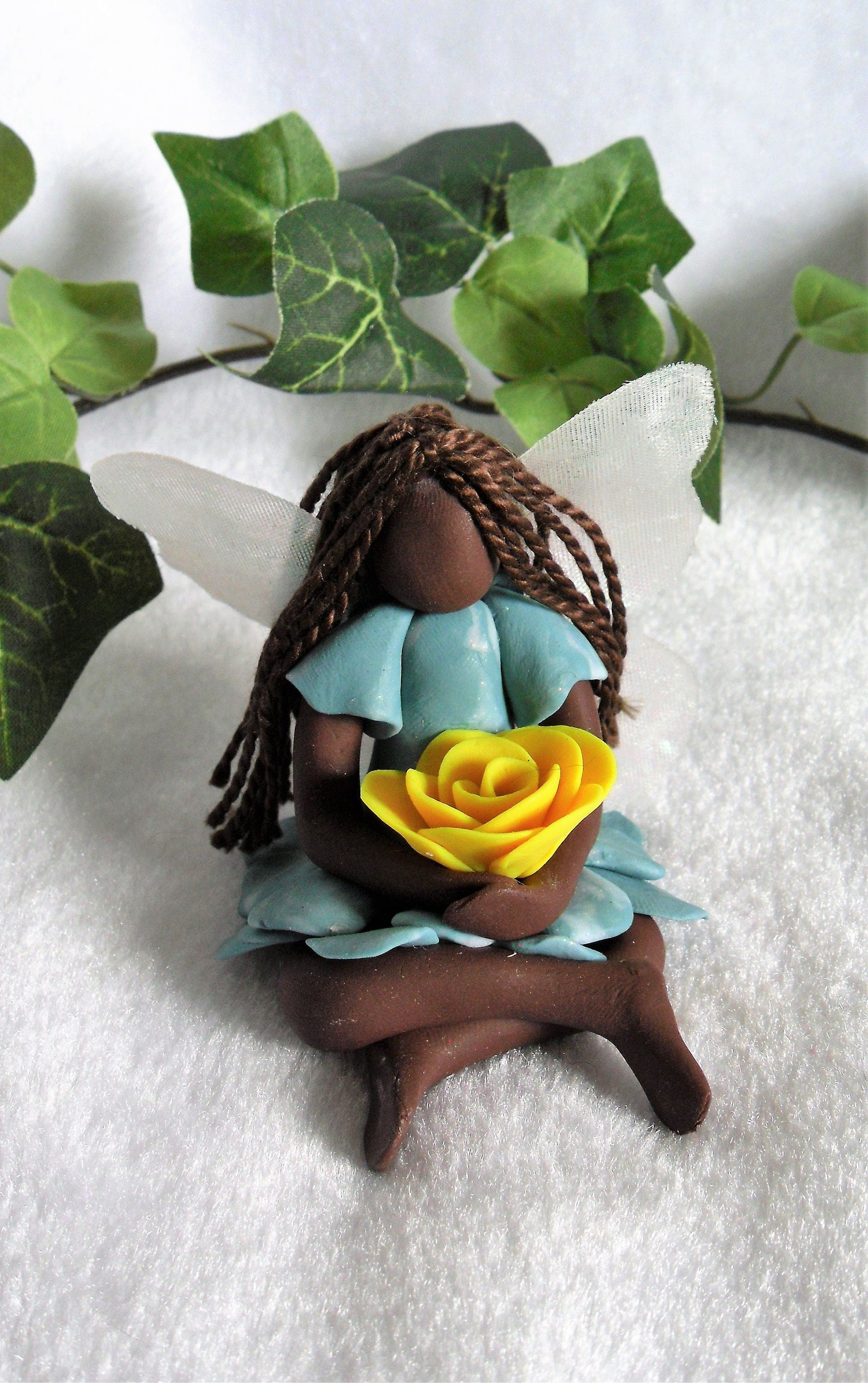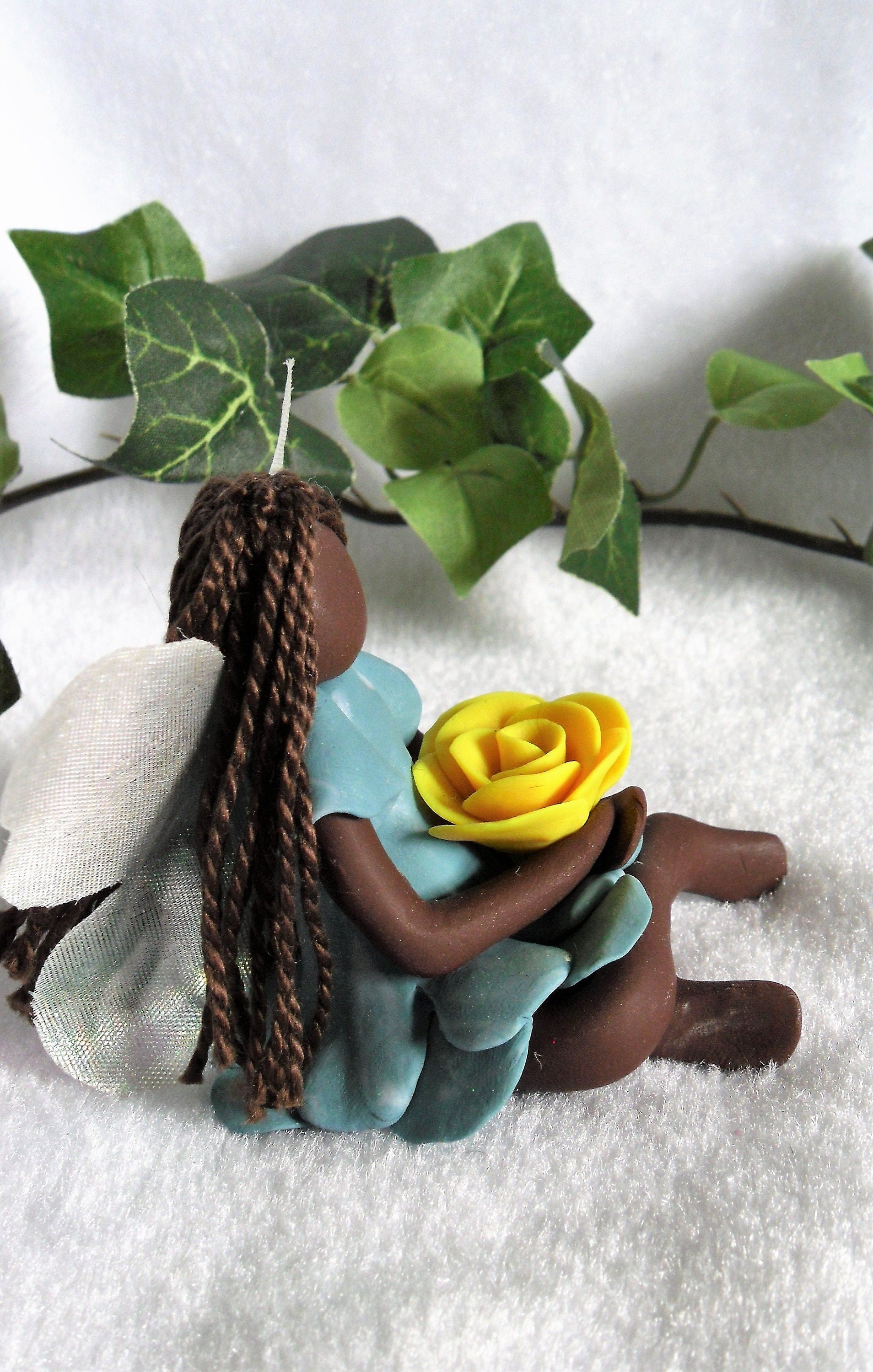 A pretty little fairy with a pretty yellow rose bud; she just couldn’t resist it!. Her dress is a marbling of teal and white that compliments her pearlescent wings and lovely brown hair. She sits approximately 2 inches high, 2 ¾ inches wide, 2 ½ inches long.