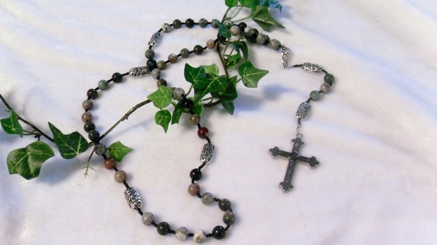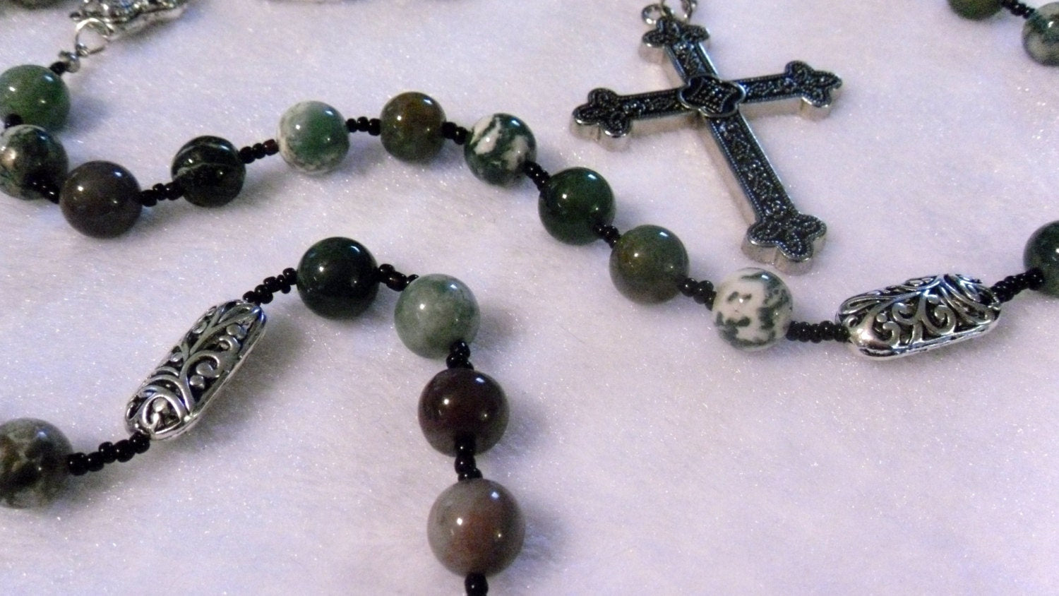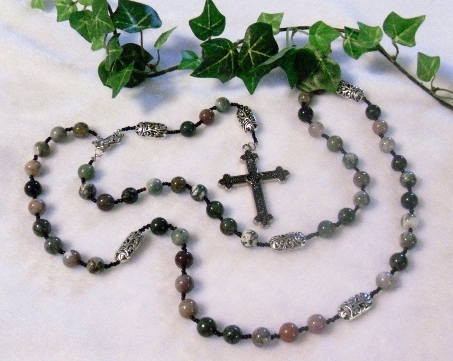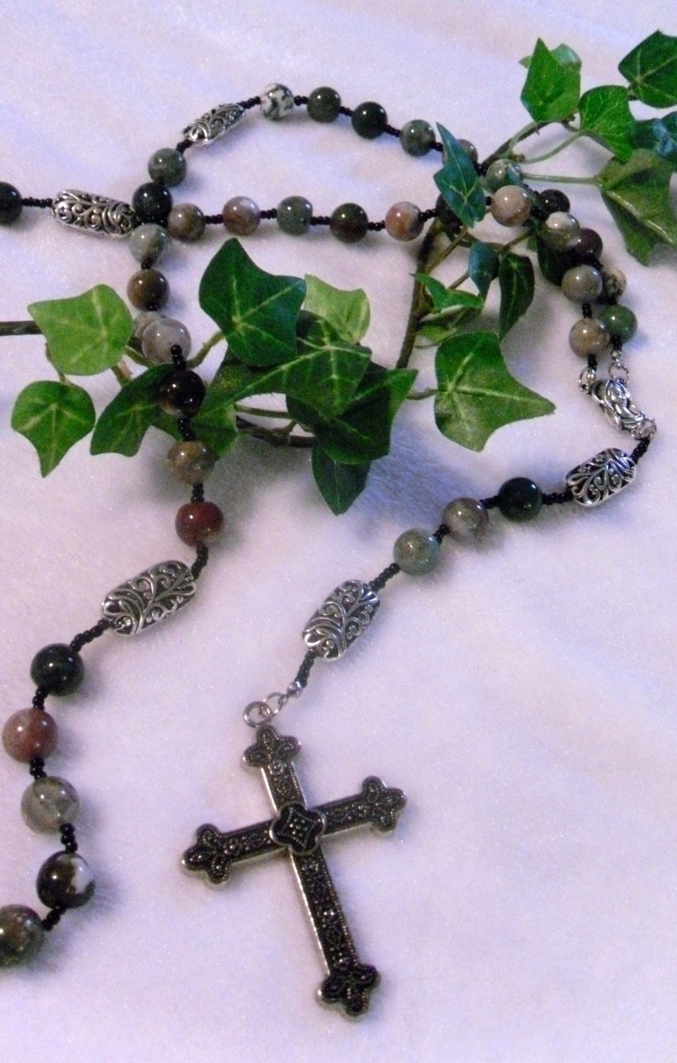 The near-myriad of colors found in the fancy Jasper Aves are subtly highlighted with the black glass seed beads they are strung and spaced with, and are further brought out with the silver plated Paters and Tibetan silver center and crucifix. This would make a beautiful gift for any occasion.