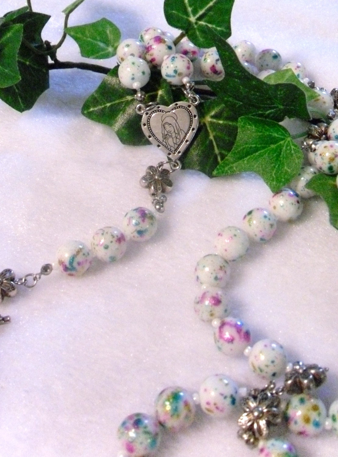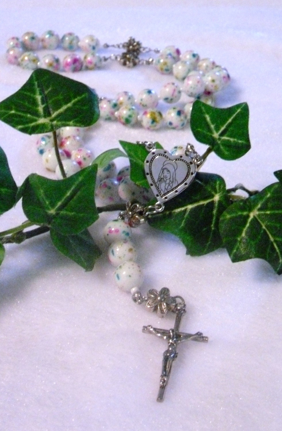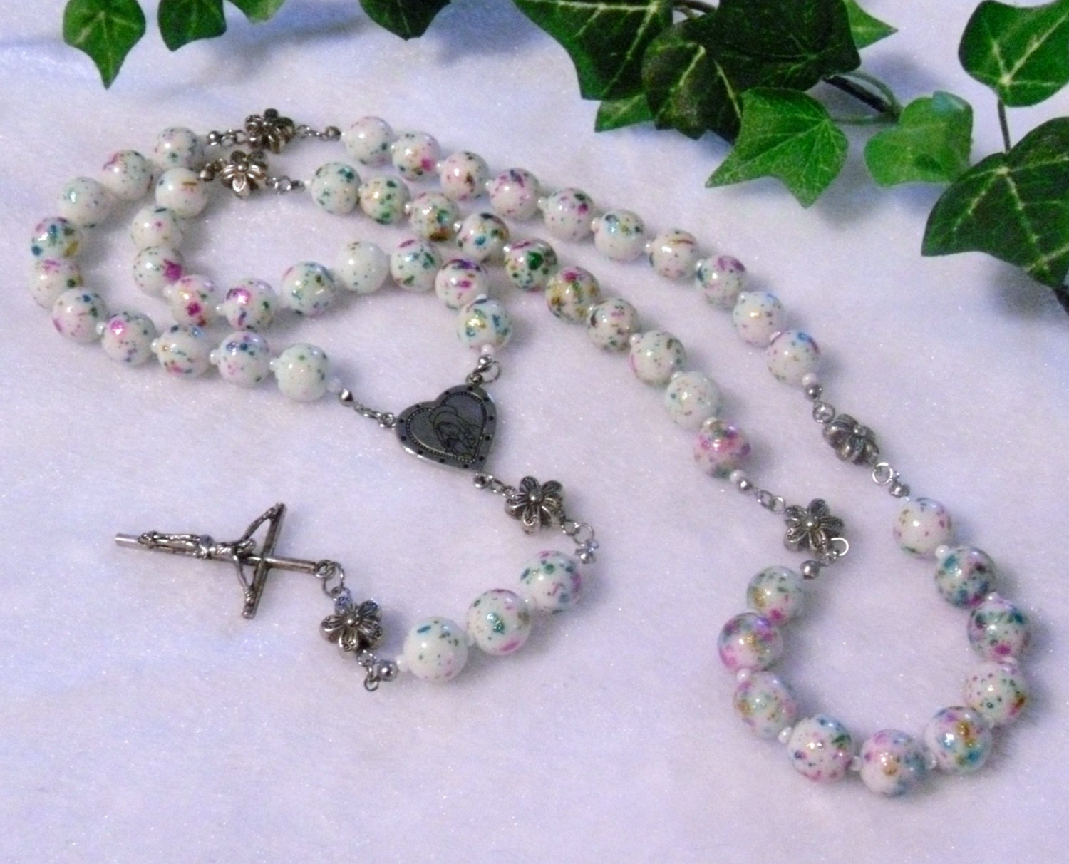What more perfect gift for a little girl's confirmation than her very own rosary? Sparkly multi-colored splatters cover white glass Aves that are strung with white glass seed beads and silver tone metal crucifix and heart shaped center. Perfect for any little girl, really, of any age. :)