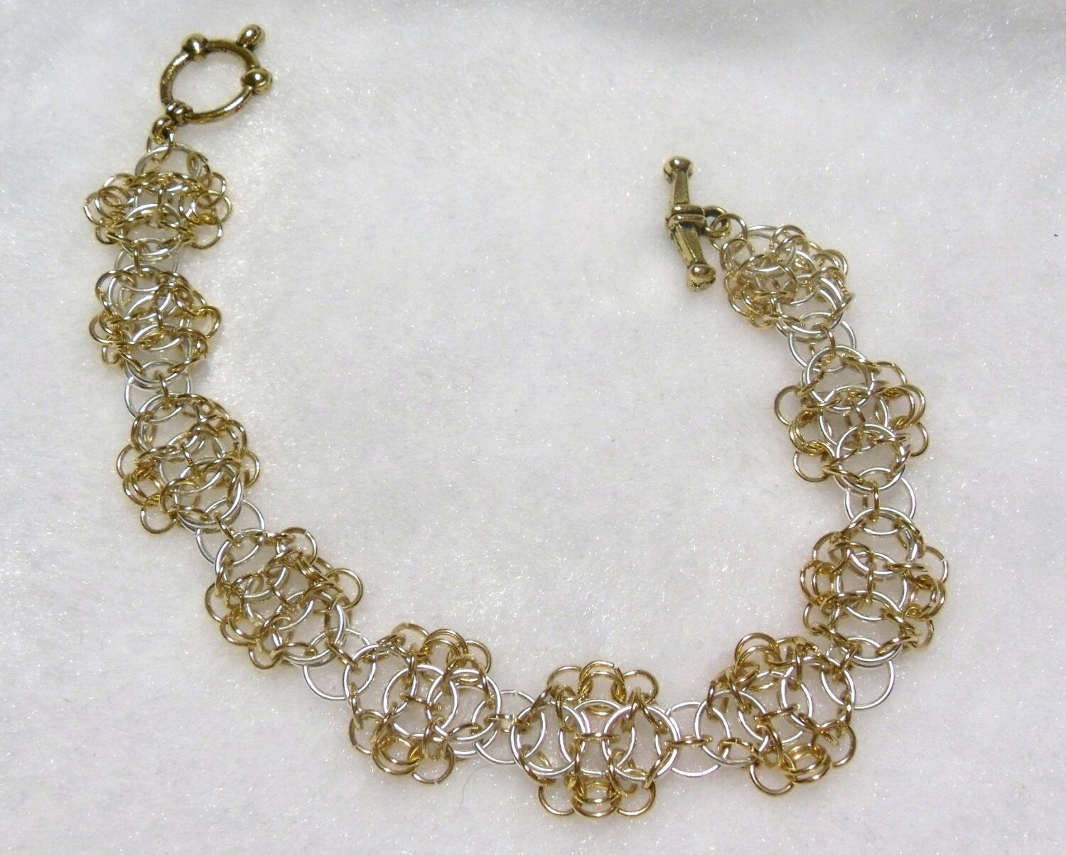 5 mm gold plated jump rings, 9 mm silver plated jump rings made in the "Camelot" pattern, gold tone toggle clasp. Thanks to CGMaille.com for the pattern tutorial. 8 inches.