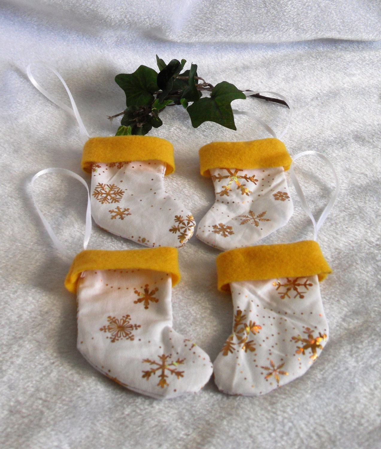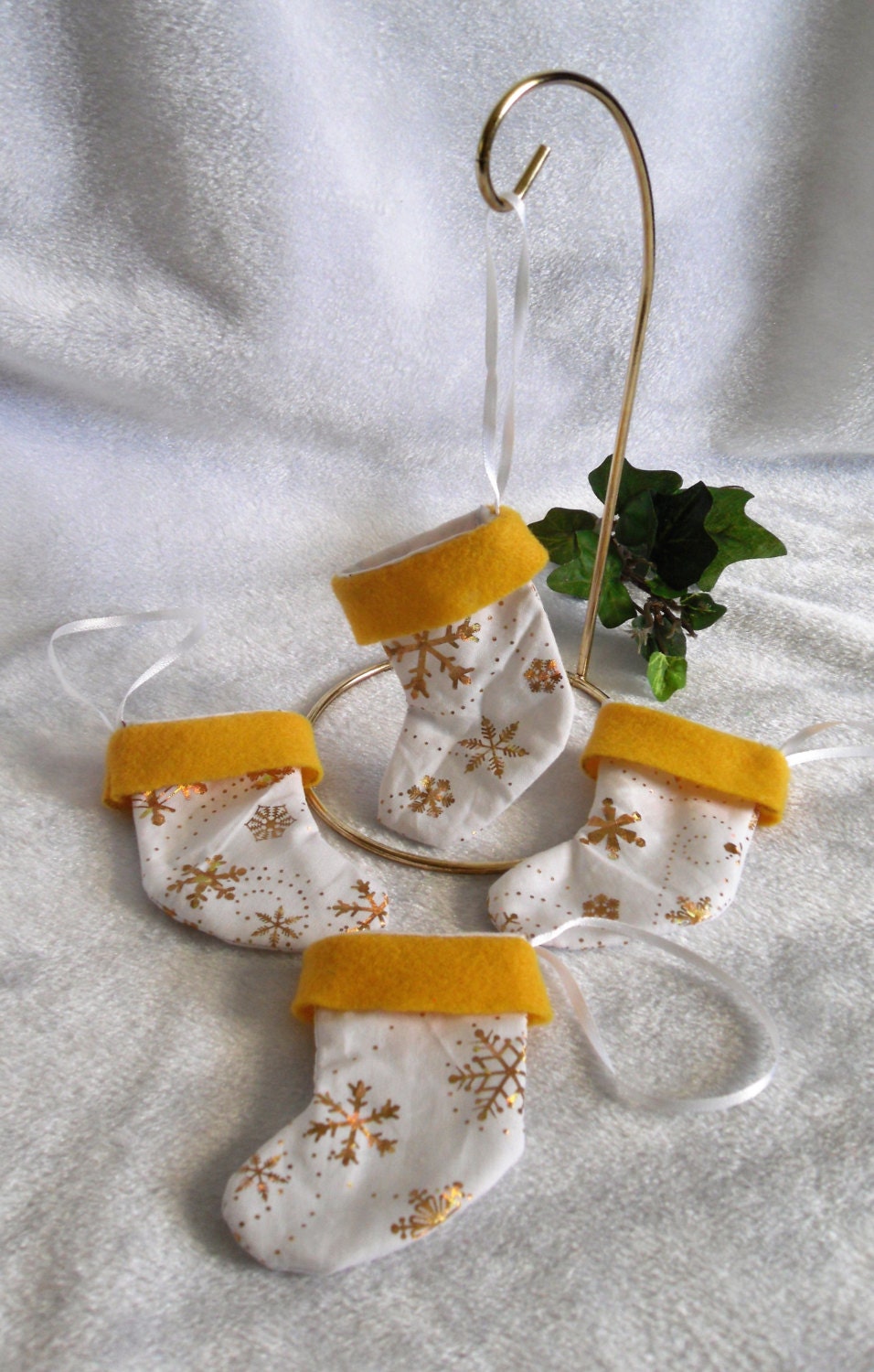 Shimmery gold metallic snowflakes falling on the white background of these stocking ornaments add a touch of glimmer and shine to the Christmas tree decor. Yellow gold felt cuffs add to the contrast while the white ribbon hangers keep it together and classy. These would also be cute tied to a gift, or as a stocking for your guinea pig or small animal!