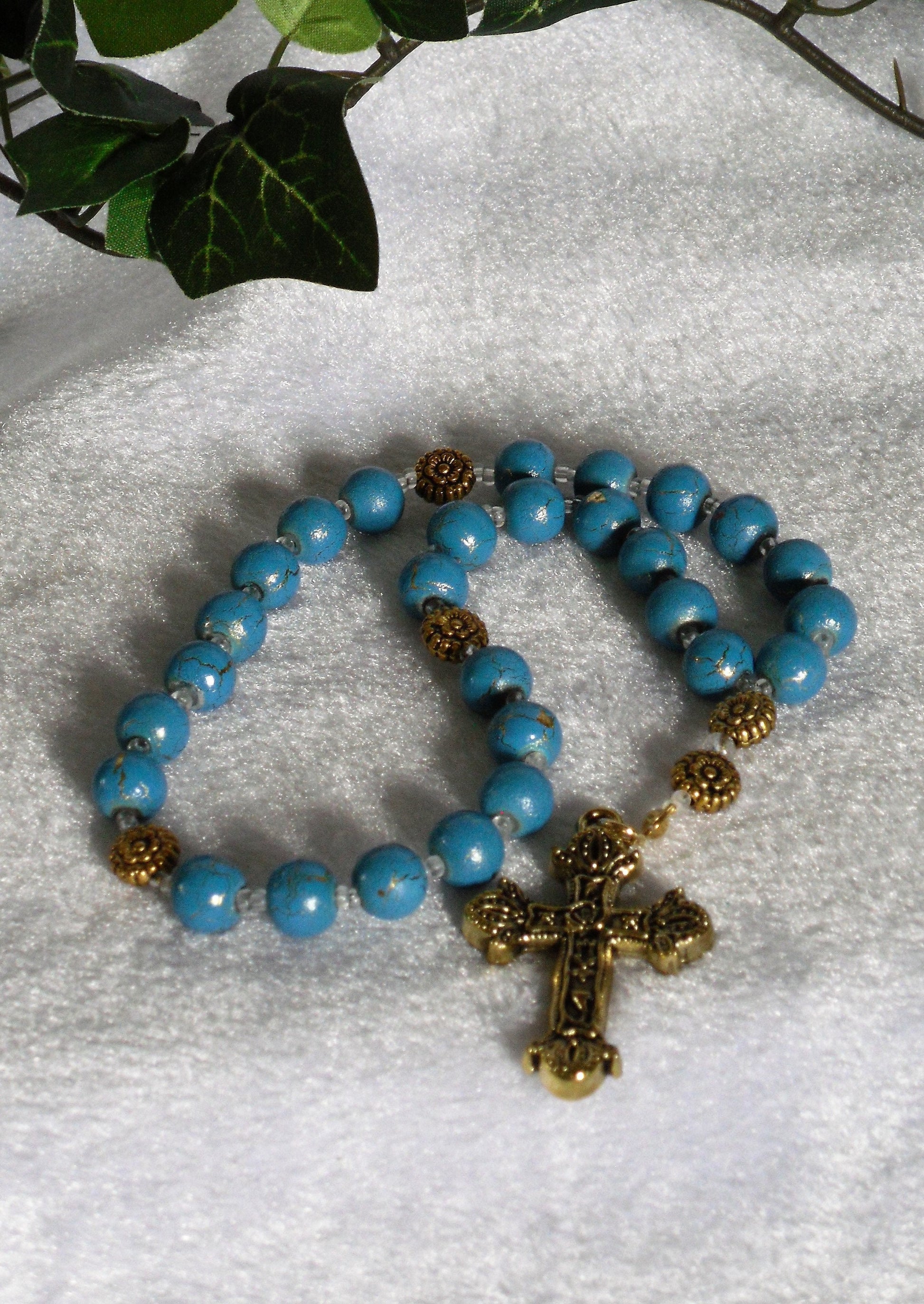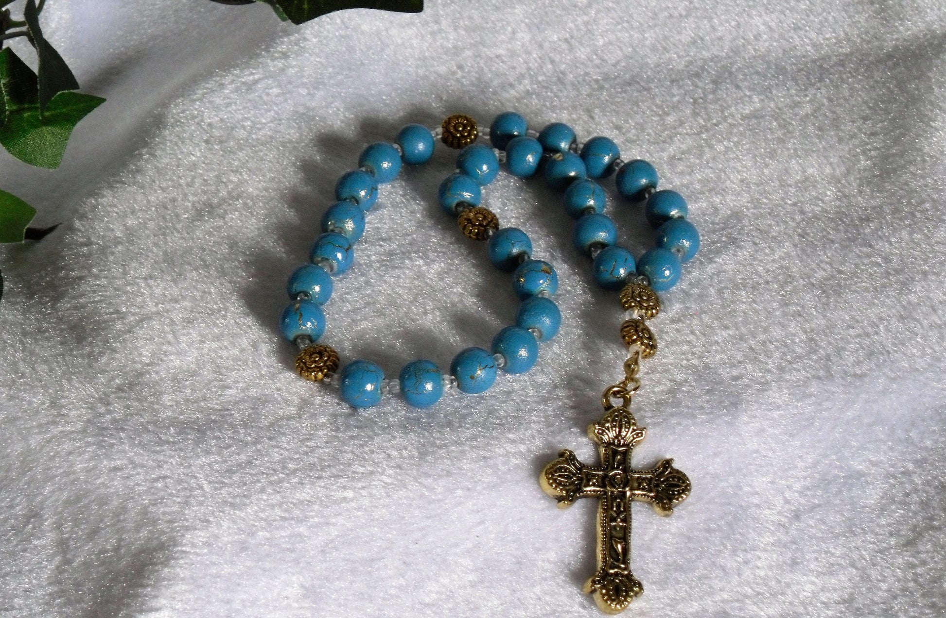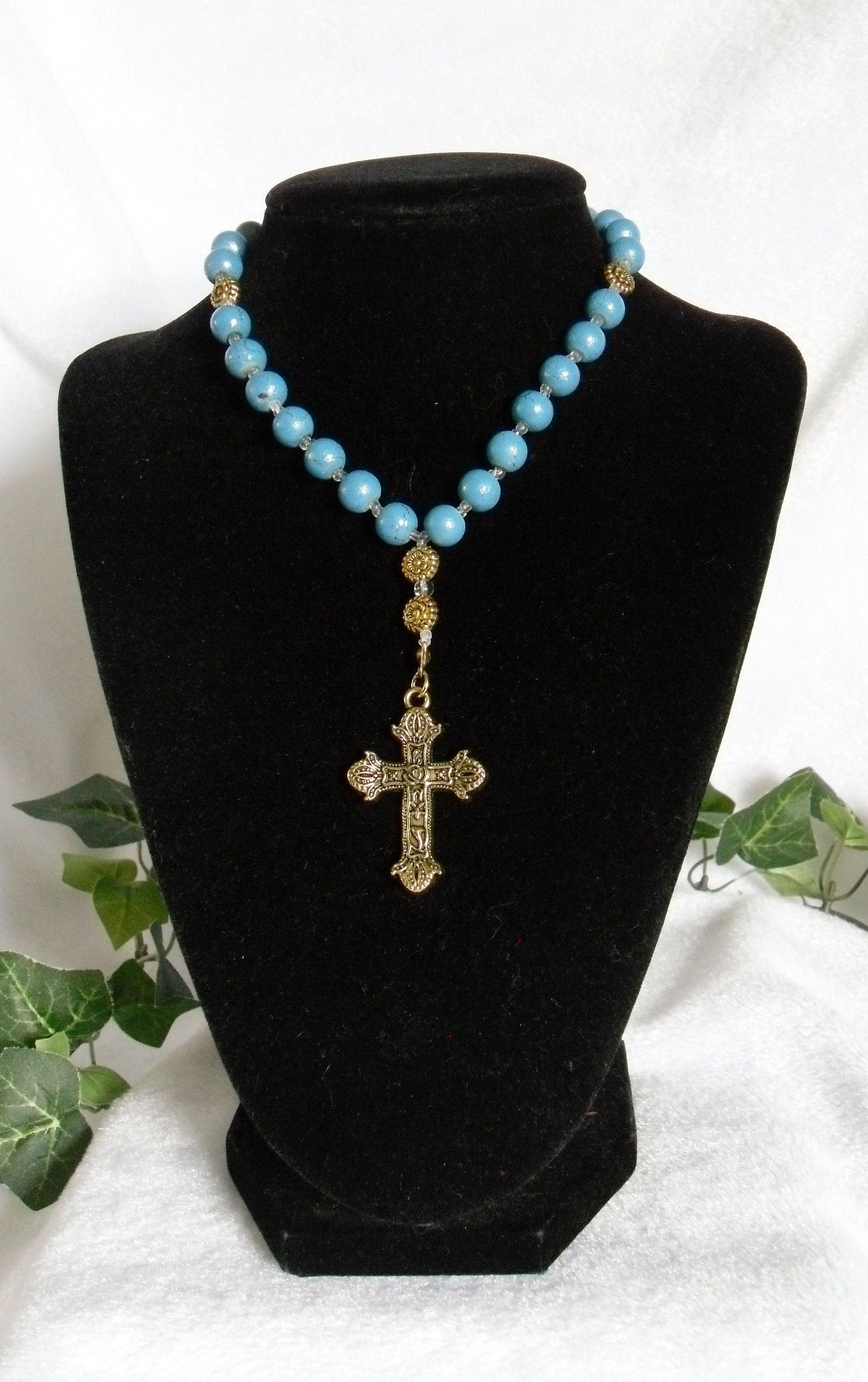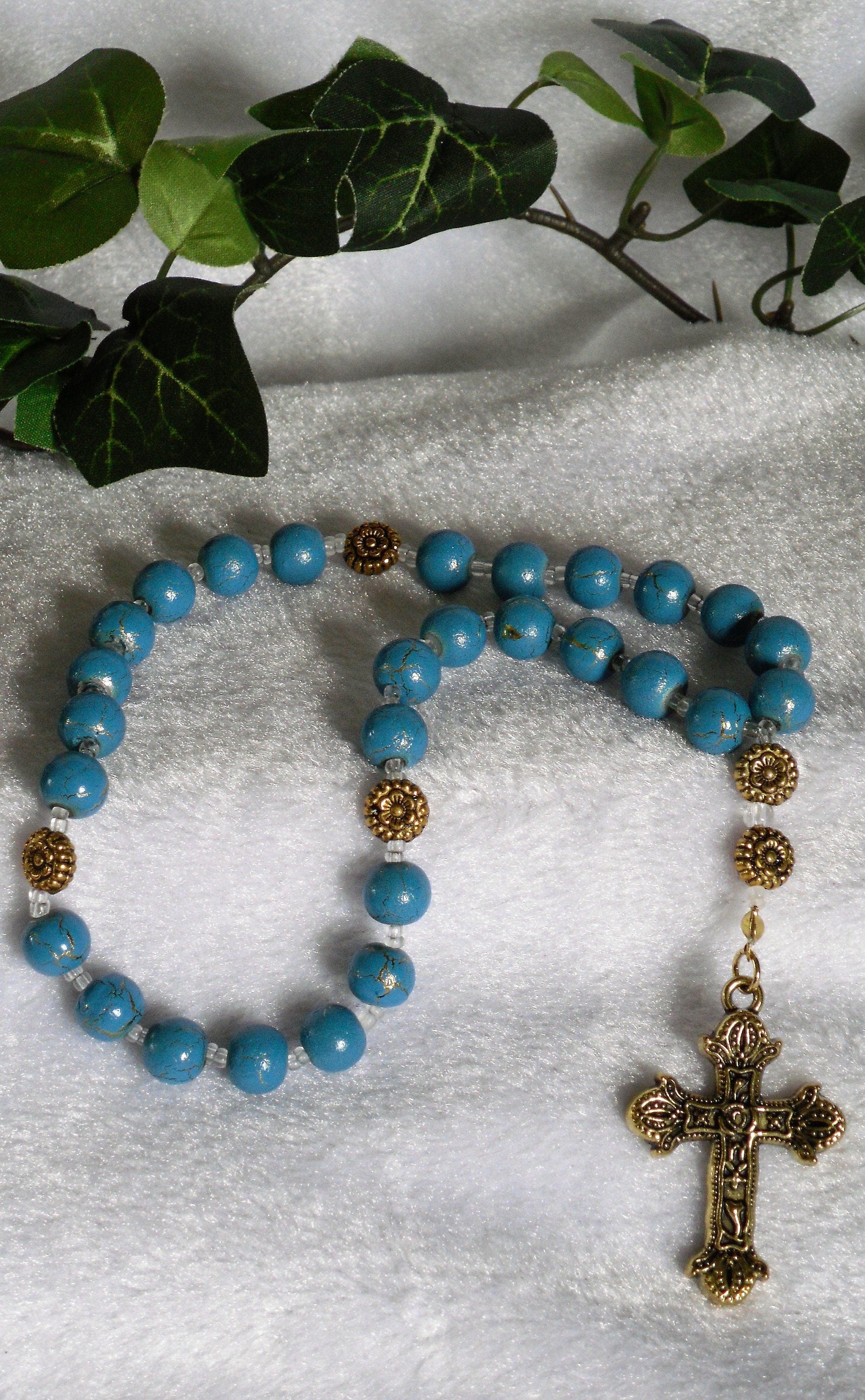 The metallic gold splatter on the turquoise glass weeks beads accent the gold tone of the metal daisy cruciform and invitatory beads without being overdramatic in this unique Anglican style rosary. The rosary is completed with a lovely metal crucifix that subtly matches the accent around the daisies while the clear glass spacers do their job without taking anything away from the overall look.