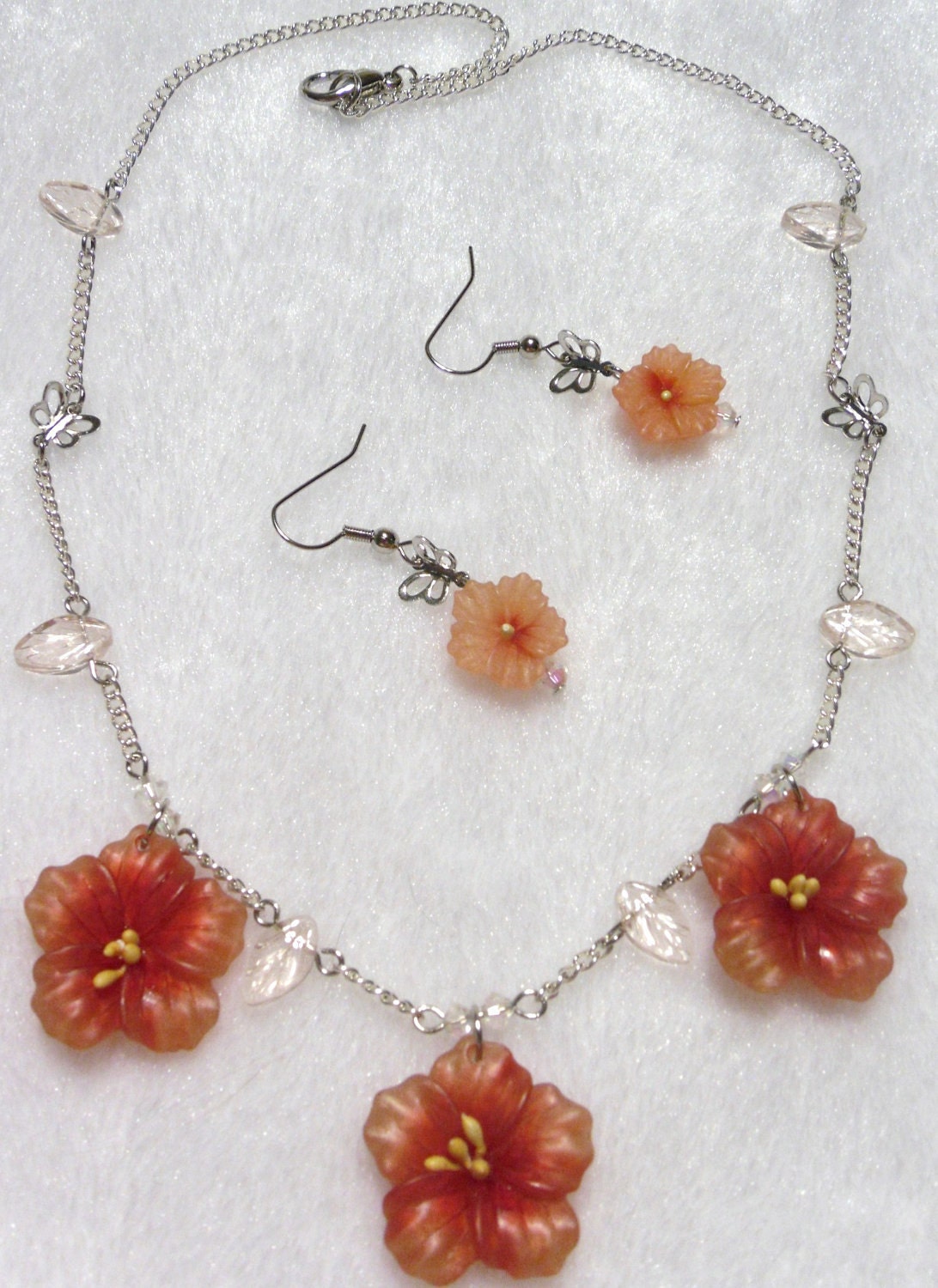 Orangey-red resin hibiscus flowers are accented with Swarovski crystals and linked with bright silver tone metal butterflies, transparent pink pressed Czech glass leaves, and bright silver tone chain. Matching earrings feature smaller flowers with Swarovski crystals and bright silver tone metal butterflies on silver tone ear wires.