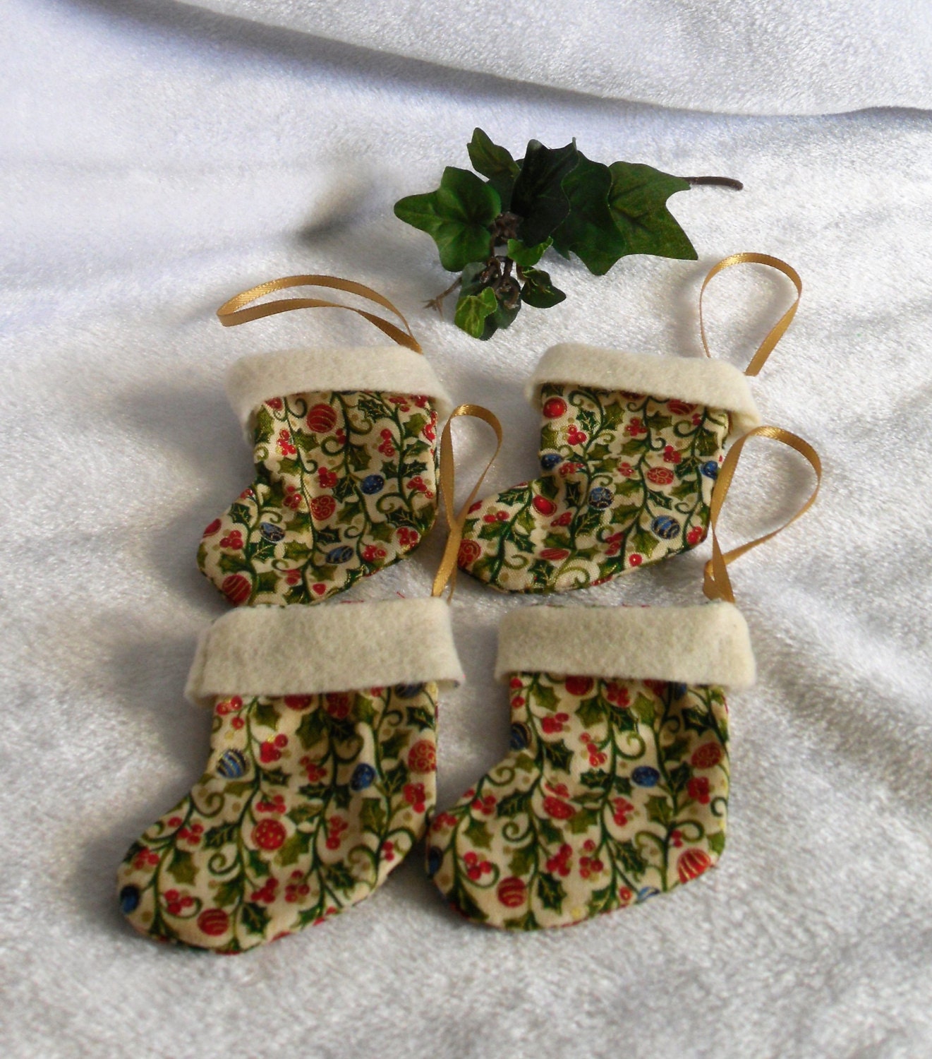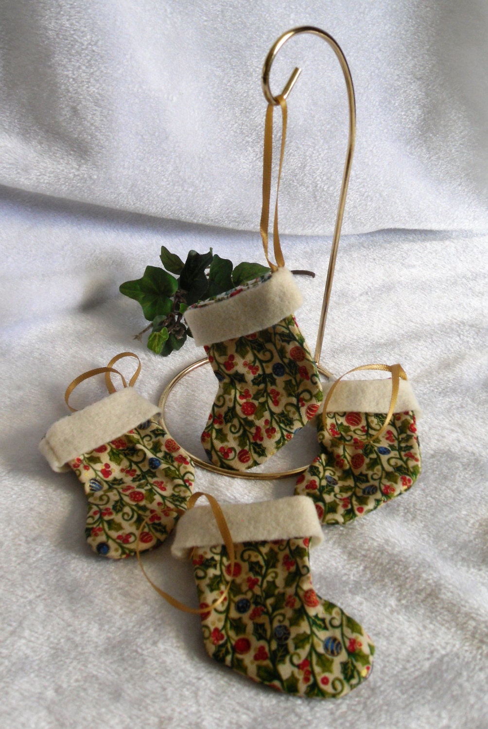 A festive holly vine print adorned with berries and multi-colored ornaments covers these little stockings that is elegant and yet festive at the same time. Each ornament has a cream colored felt cuff and a gold ribbon to accent the overall design.