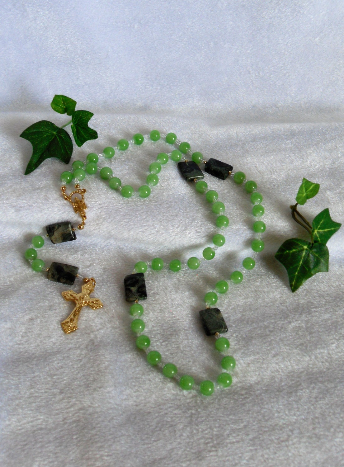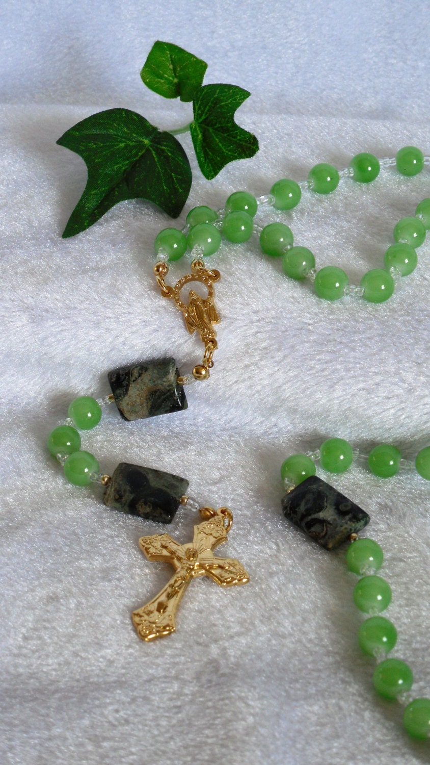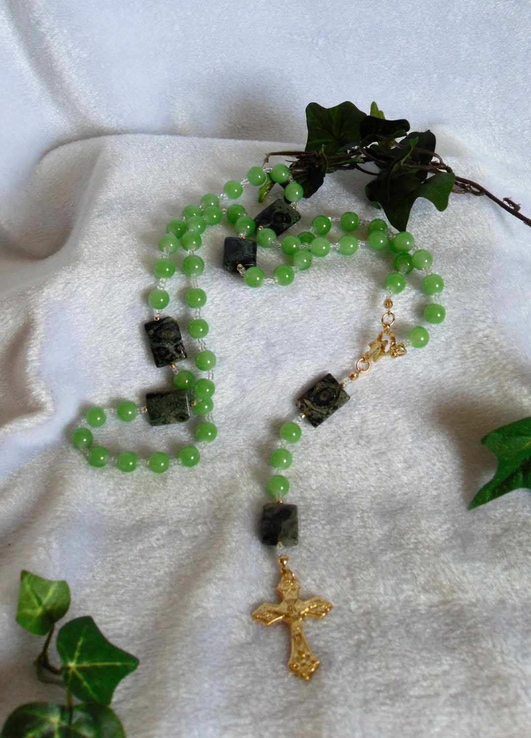 Light jade green colored milky glass Aves bring out the variegations in the Kambaba jasper Paters wonderfully. The swirls and colors within each Pater stone are reminiscent of a greener version of Van Gogh's famous "Starry Night"-- beautiful and unique. The photos do not do the stones justice. Bright gold tone metal center and crucifix.