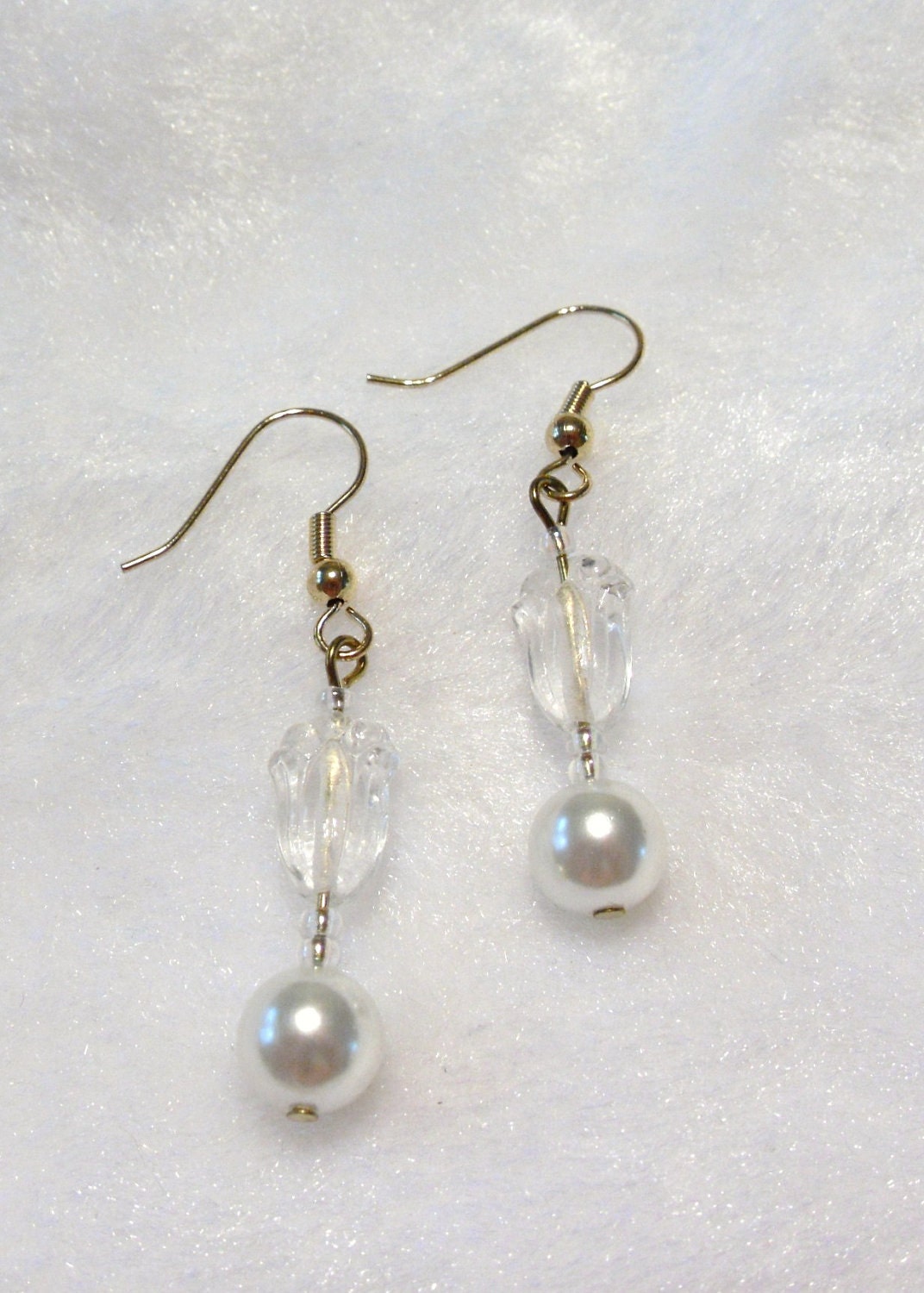 Clear pressed Czech glass tulips with "crystal" seed beads and white faux pearls on gold tone ear wires. 1 1/8 inches.