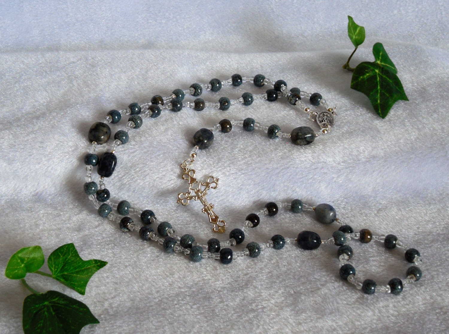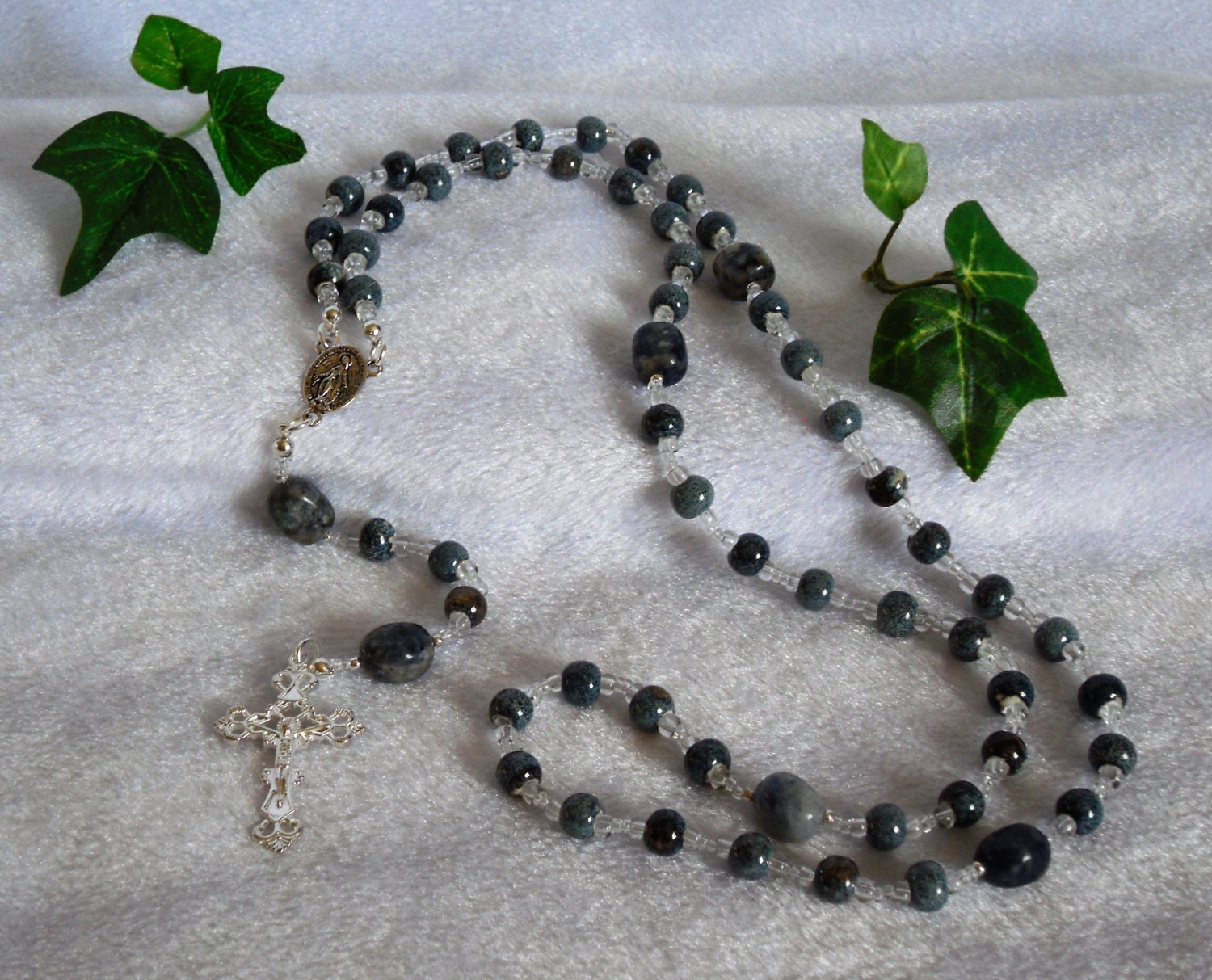 The speckling and variegation of the blues and browns in the ceramic Aves brings out the wonderful variations and variegations within the natural lapis lazuli stone Paters. All are strung with clear glass seed beads and complimentary silver glass seed beads and bright silver tone metal center and crucifix.
