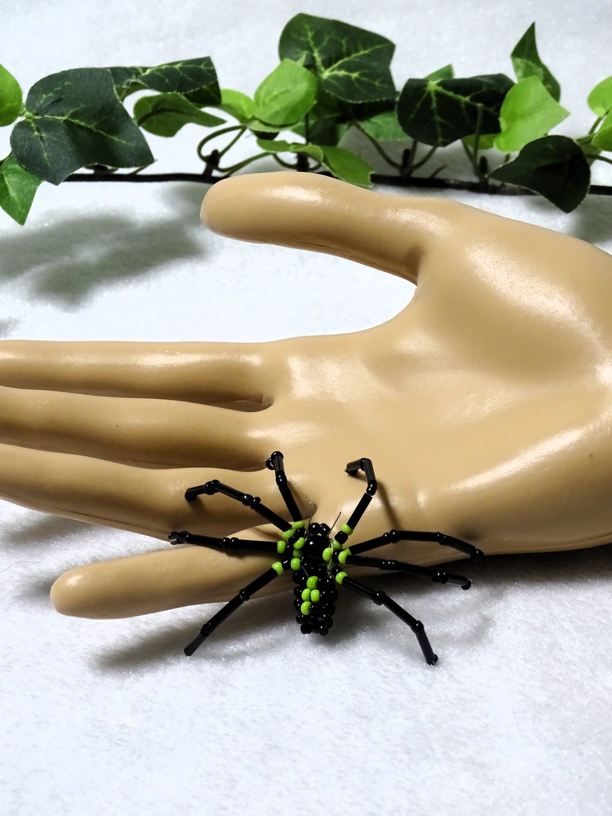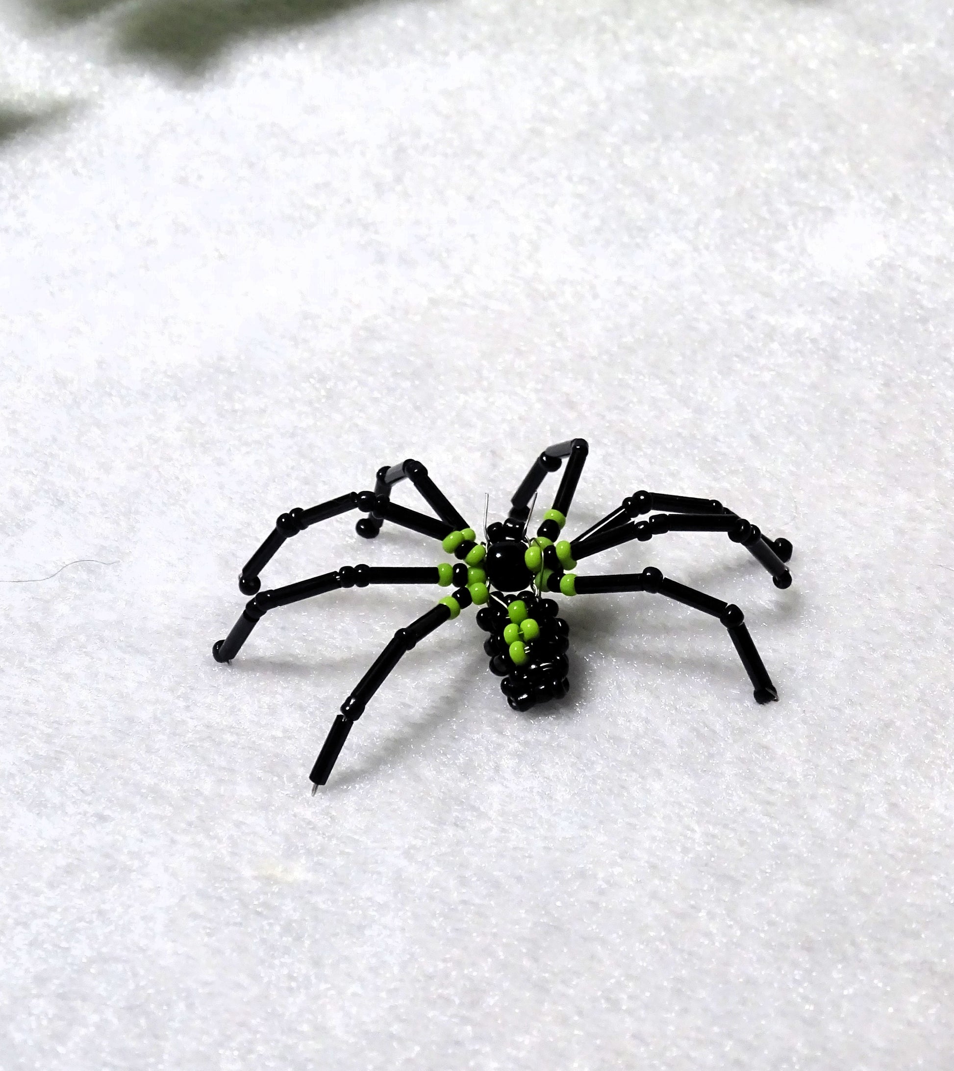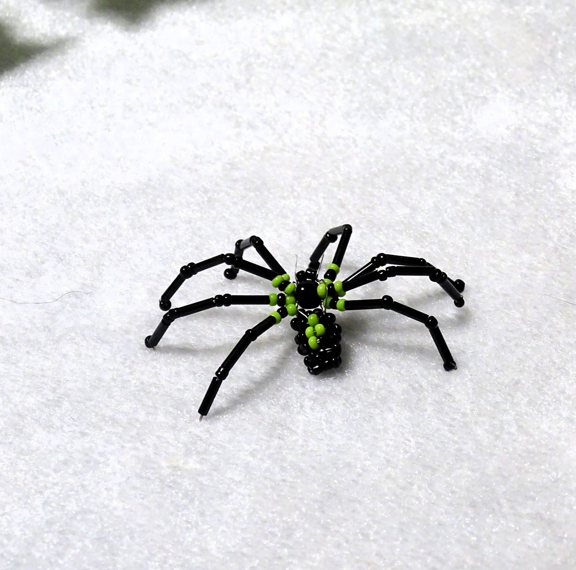 This little spider is made from black and lime green glass seed beads and black glass bugle beads in an original design. It has a lot of character that was hard to capture in pictures. It is poseable, just be careful when doing so because bending the wire inside too much could cause it to break.
