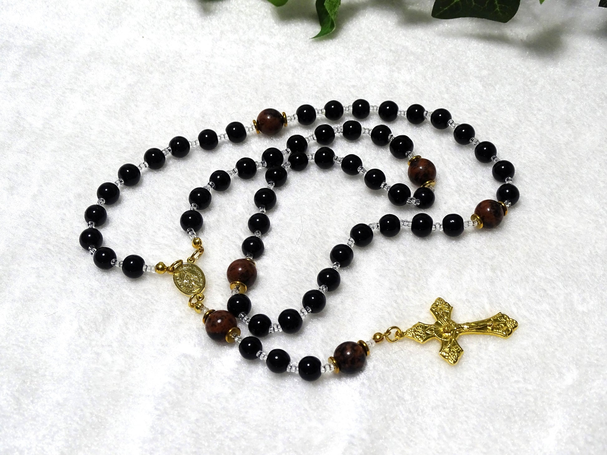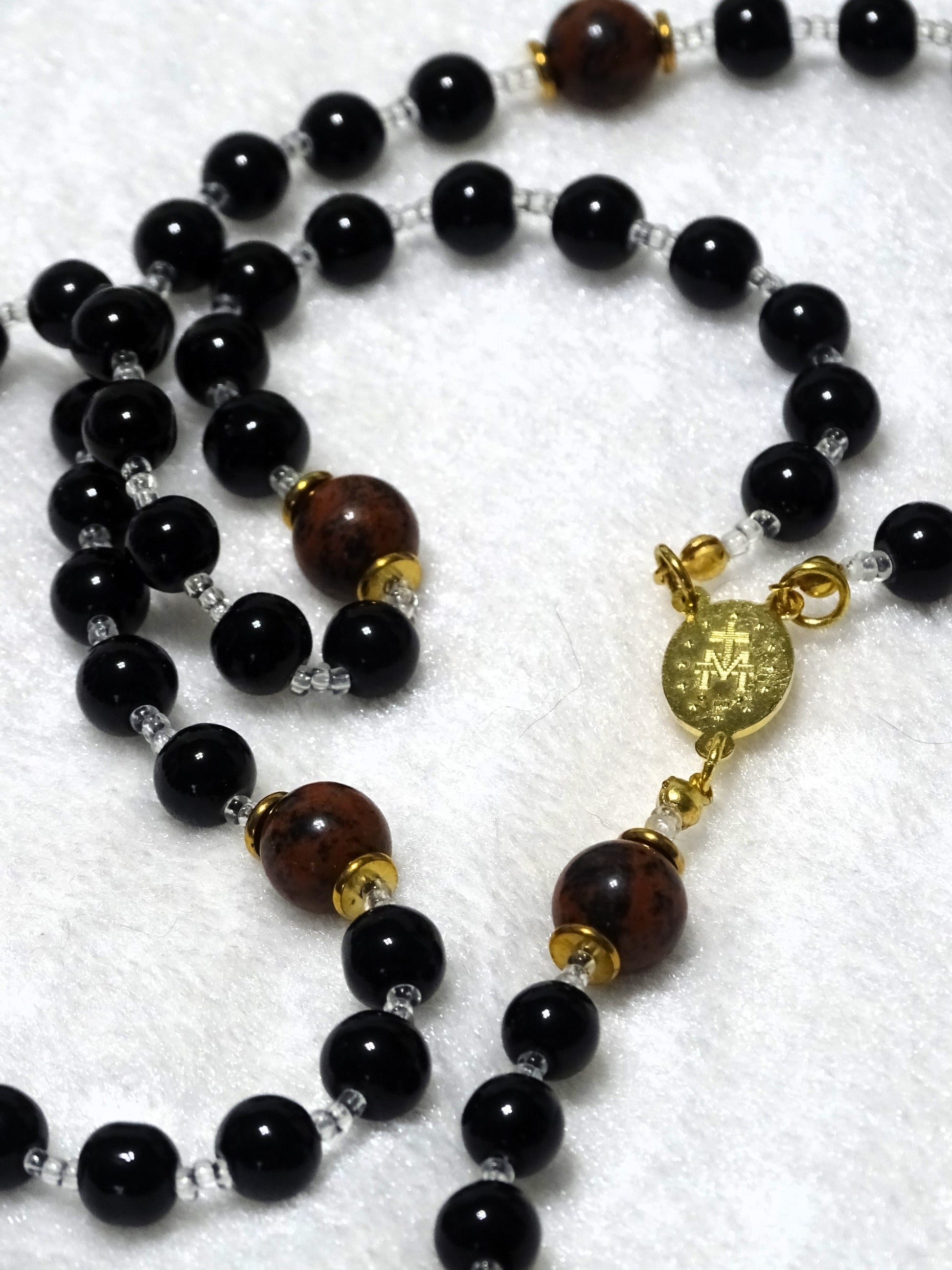 The rich tones of the mahogany obsidian stone Paters are masterpieces themselves in this one-of-a-kind piece. Their natural beauty is quietly yet boldly complimented with black glass Aves and Italian gold tone metal center and crucifix. Movement is created with clear glass seed beads. This rosary was designed and made to last a lifetime with proper handling and care.