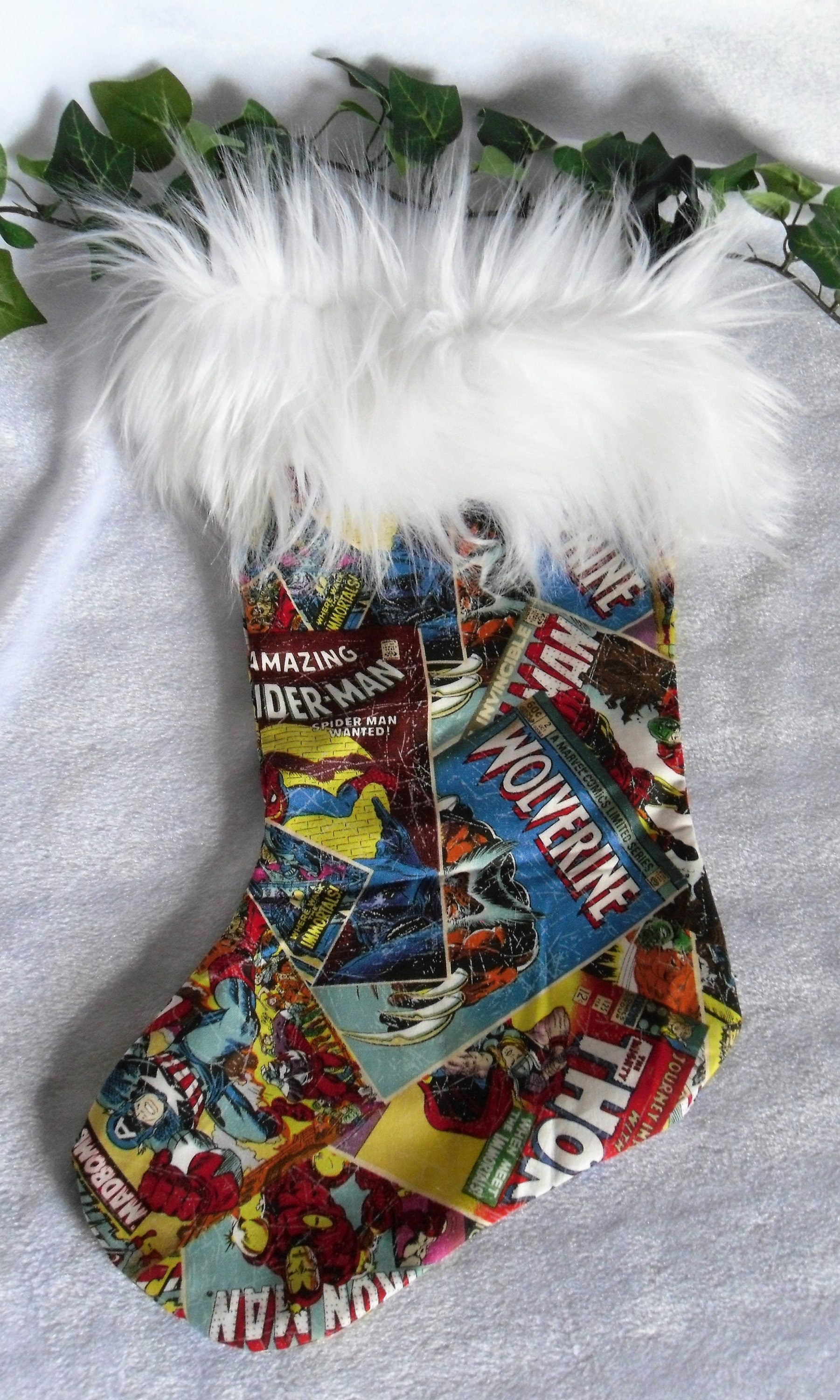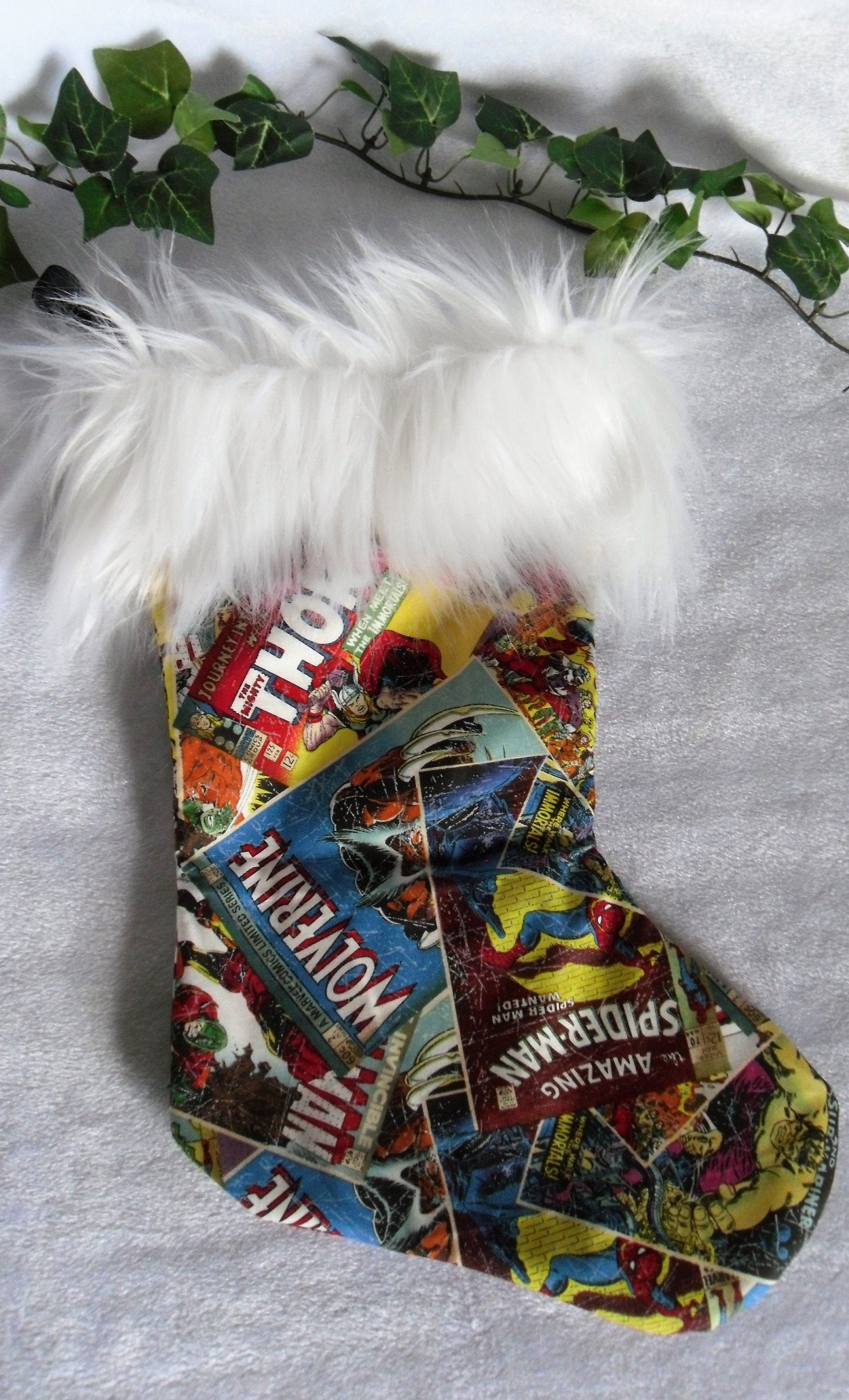 Some of the most iconic and classic MARVEL comic book covers are printed all over this 100% cotton stocking (excluding fur trim) including Wolverine, Spider-Man, and Iron Man. If you have a MARVEL fan you need a unique gift for, this could be it! The stocking is fully lined with 100% cotton muslin and measures 15 inches high and 9 ½ inches wide.