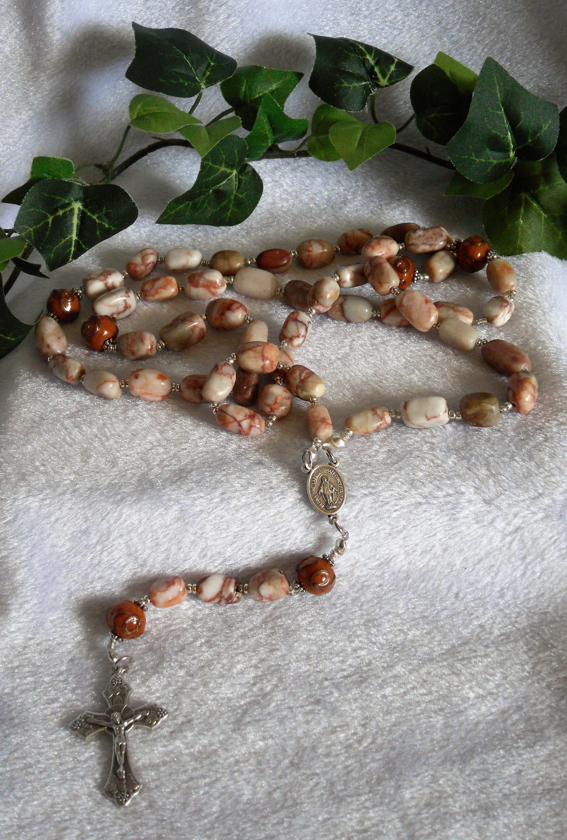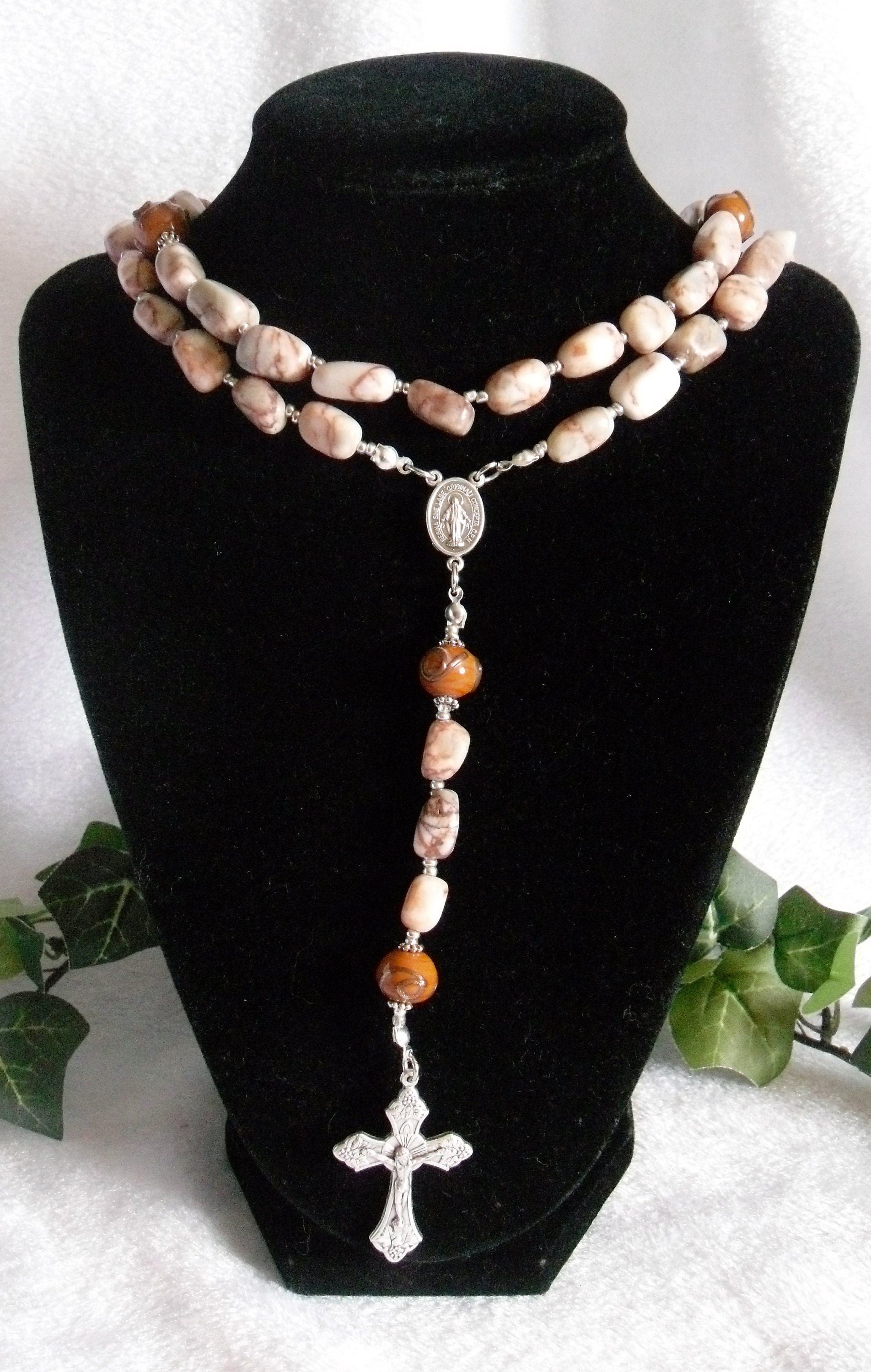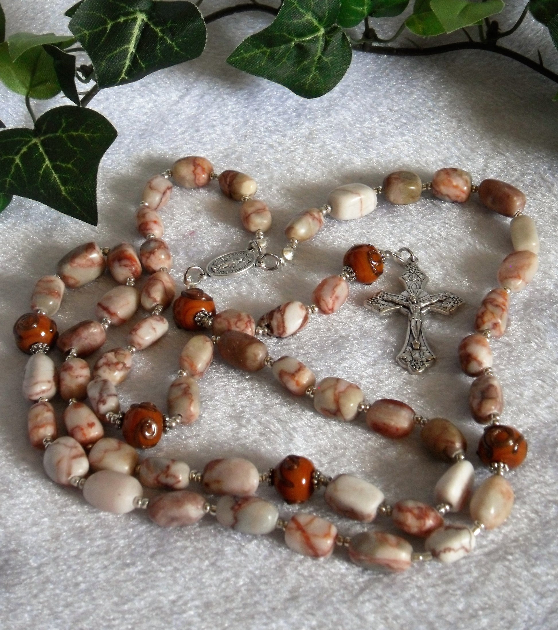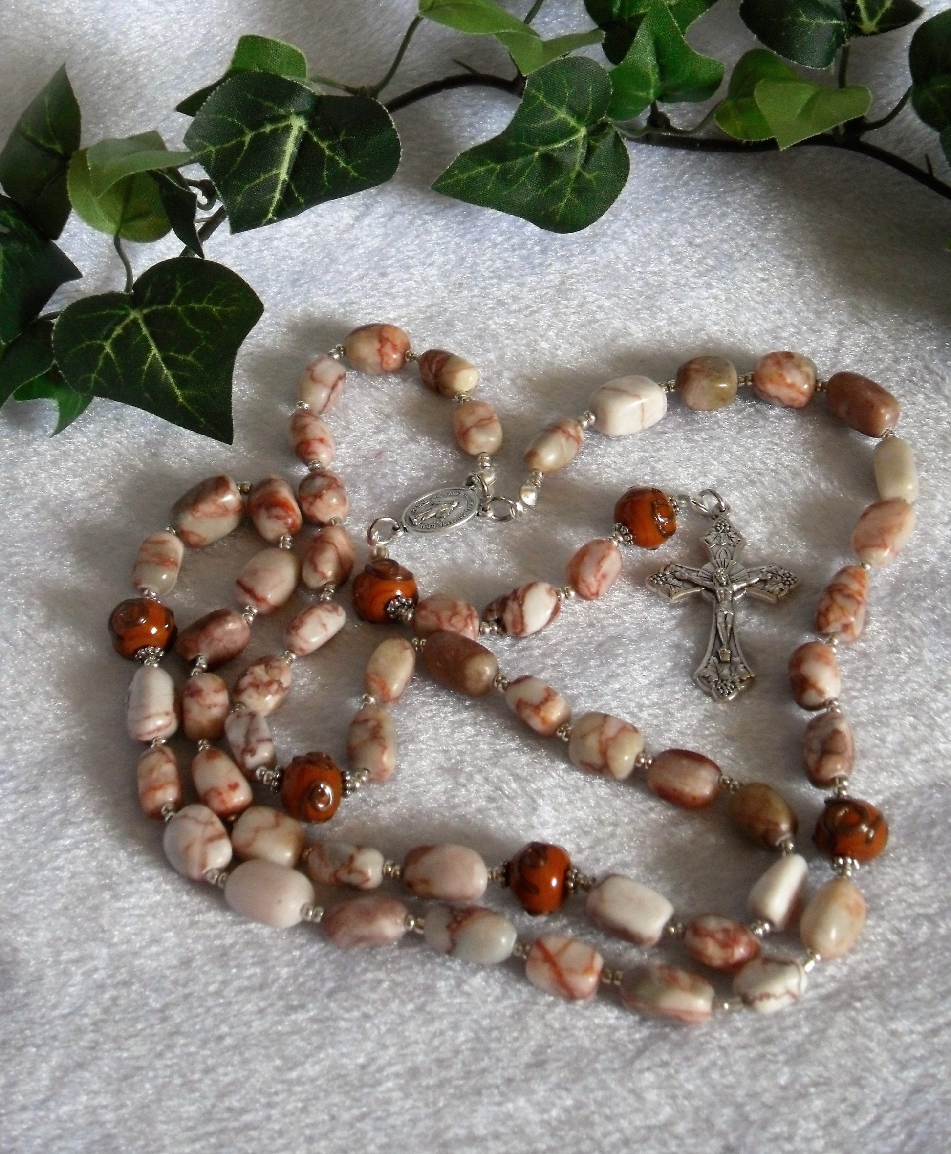 The Aves consist not only of matrix jasper but of orange line jasper as well, stones so similar it is difficult to tell them apart. Each one is its own unique beauty that is accented by the rust-colored textured glass Paters that separate each decade. Silver tone Italian metal center and crucifix complete this one of a kind piece that, with proper care and handling, will last a lifetime.