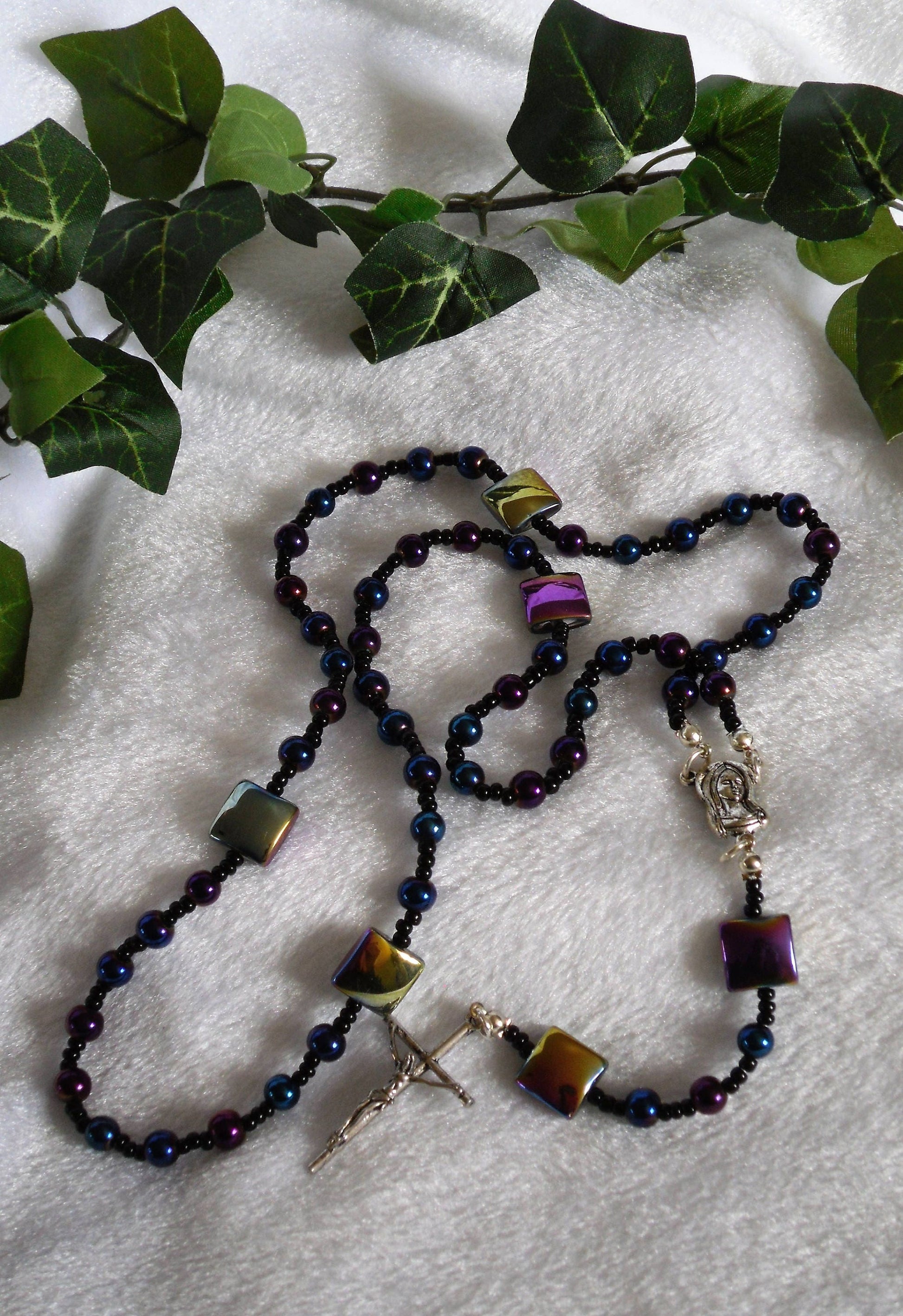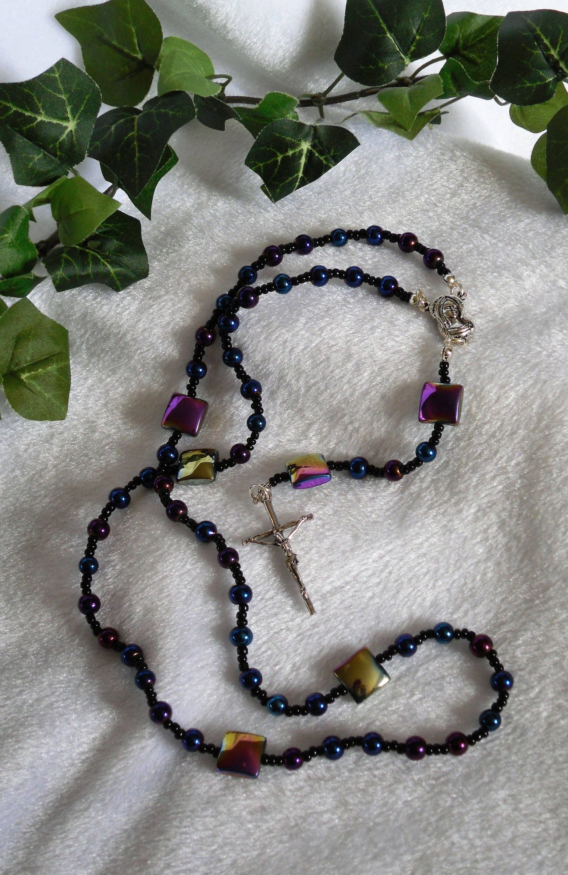 I never quite know how to describe AB finish other than beautiful in an almost space-y way, but that's just me. What I love about it, though, is how it's not just one color but many all in one place--that is how each round glass Ave is while each Pater is a larger, flat square pillow with its own unique finish. All are spaced with black glass seed beads to give this rosary a nice slide in the hand from bead to bead. Silver tone metal center and crucifix.