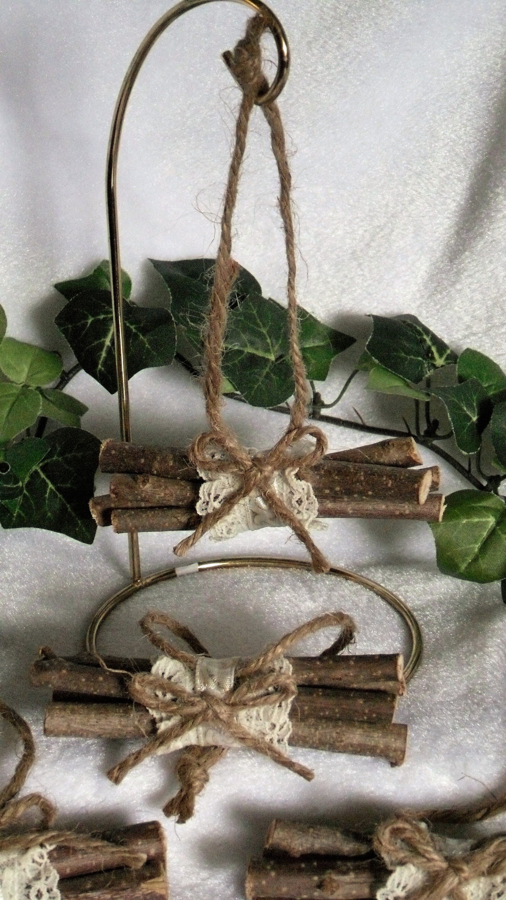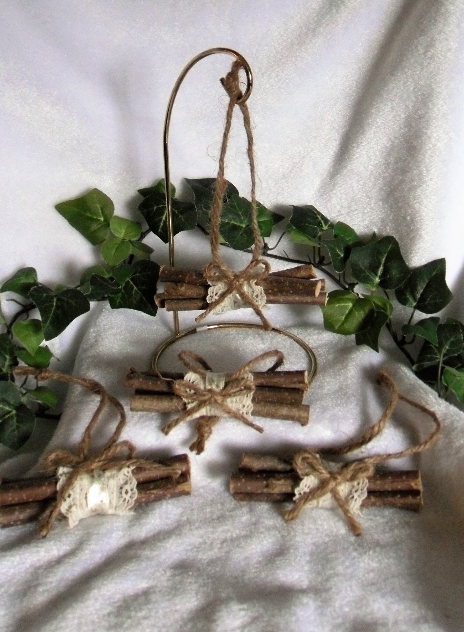 A little country, a little rustic, a little old-fashioned, a lot of wonderful in each ornament. Bundles of real sticks that resemble mini logs are tied together with lace and twine that will add a simple country charm wherever you hang them. They each measure approximately 4 inches long, 1 inch wide, 1 inch high not including twine hanger.