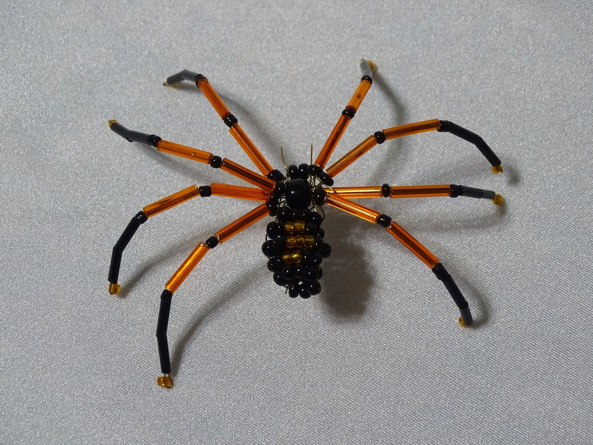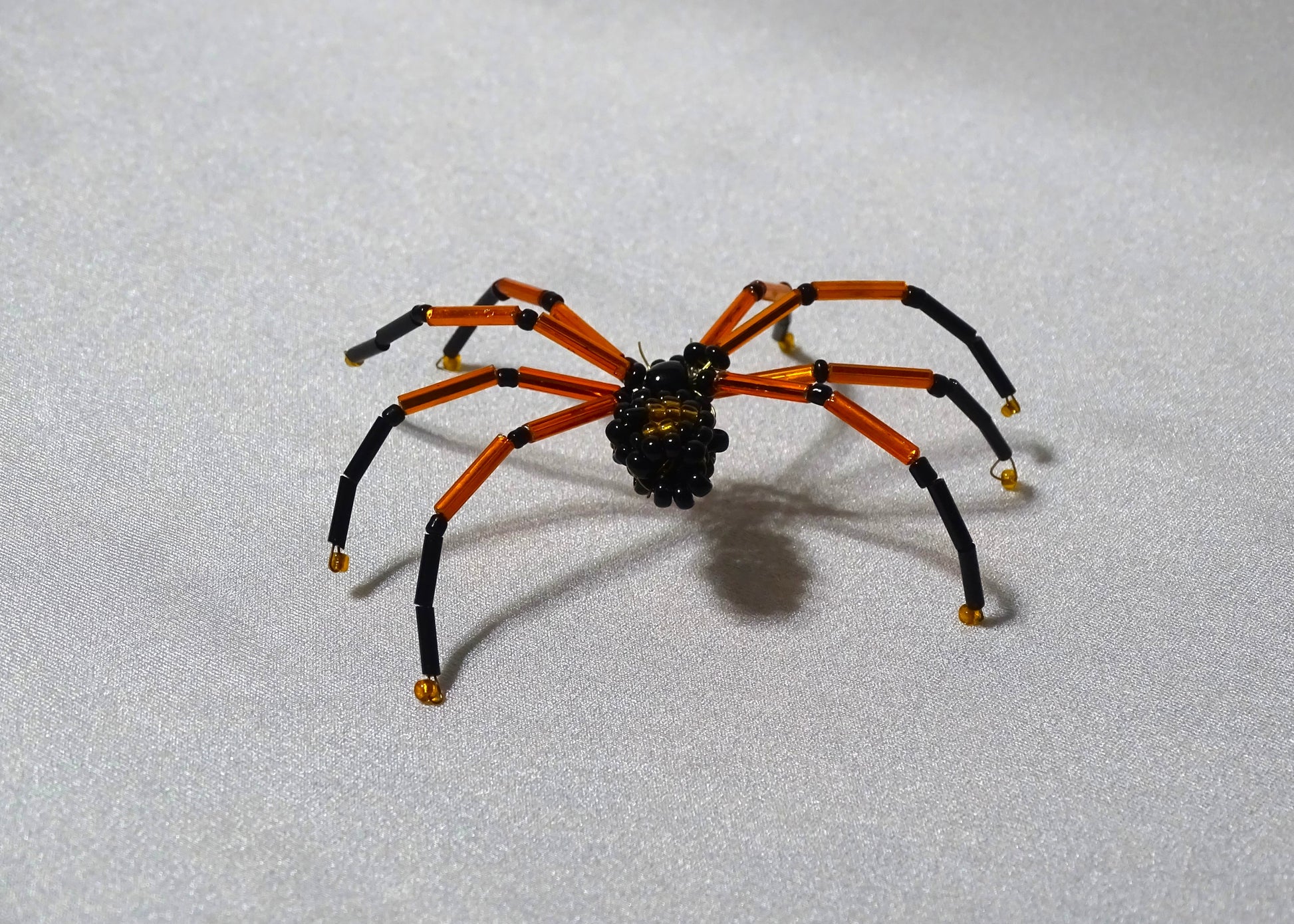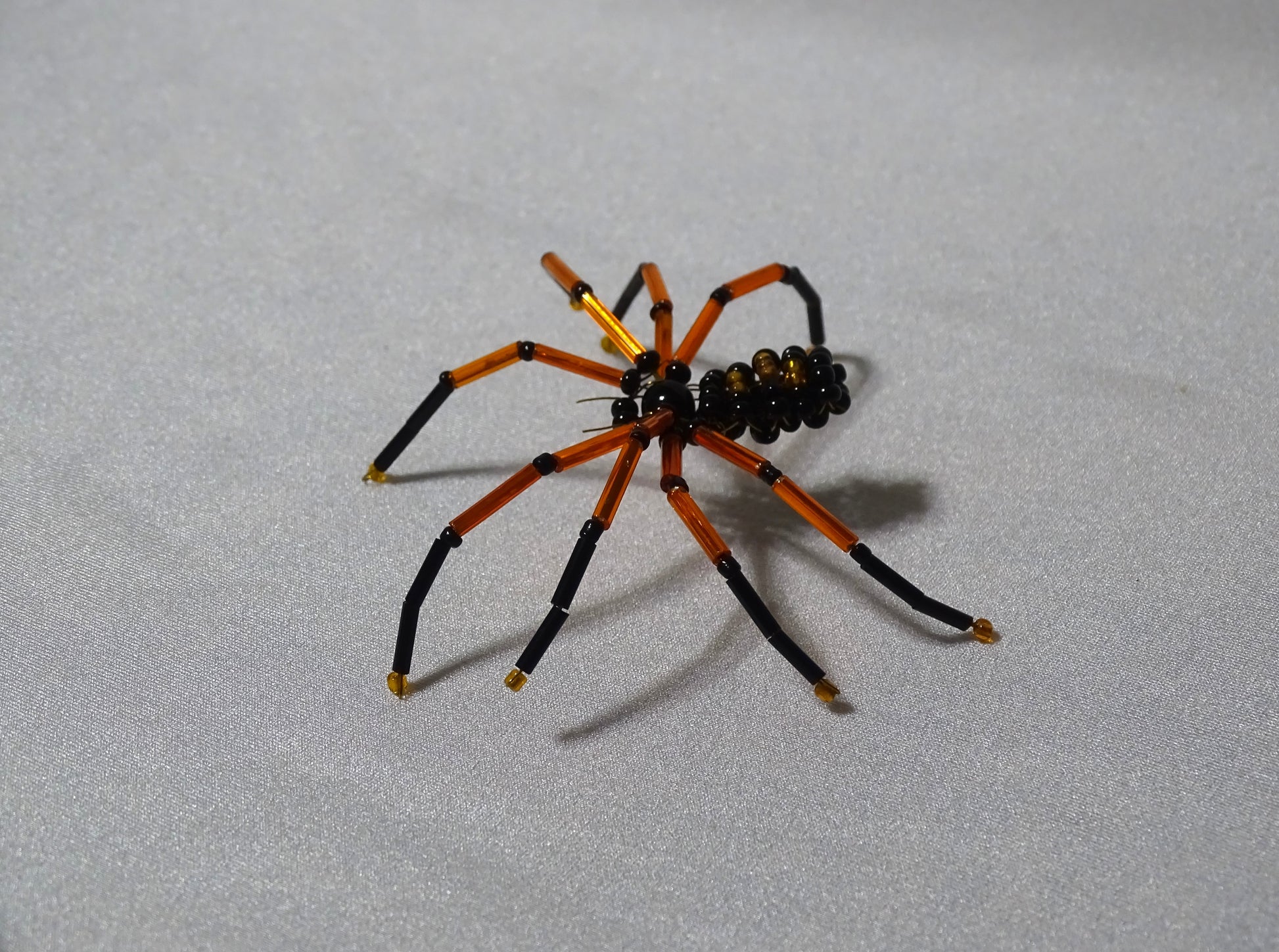 There are only two colors that make up this spider, but boy does it play them well! Shimmery metallic lined orange legs end in shiny black in a dramatic fashion while matching transparent orange glass seed beads create a subtle pattern on the back of the abdomen. Measures approximately 2 ½ inches wide depending on how its posed, but caution should be taken when posing as too much bending can break the wire inside.