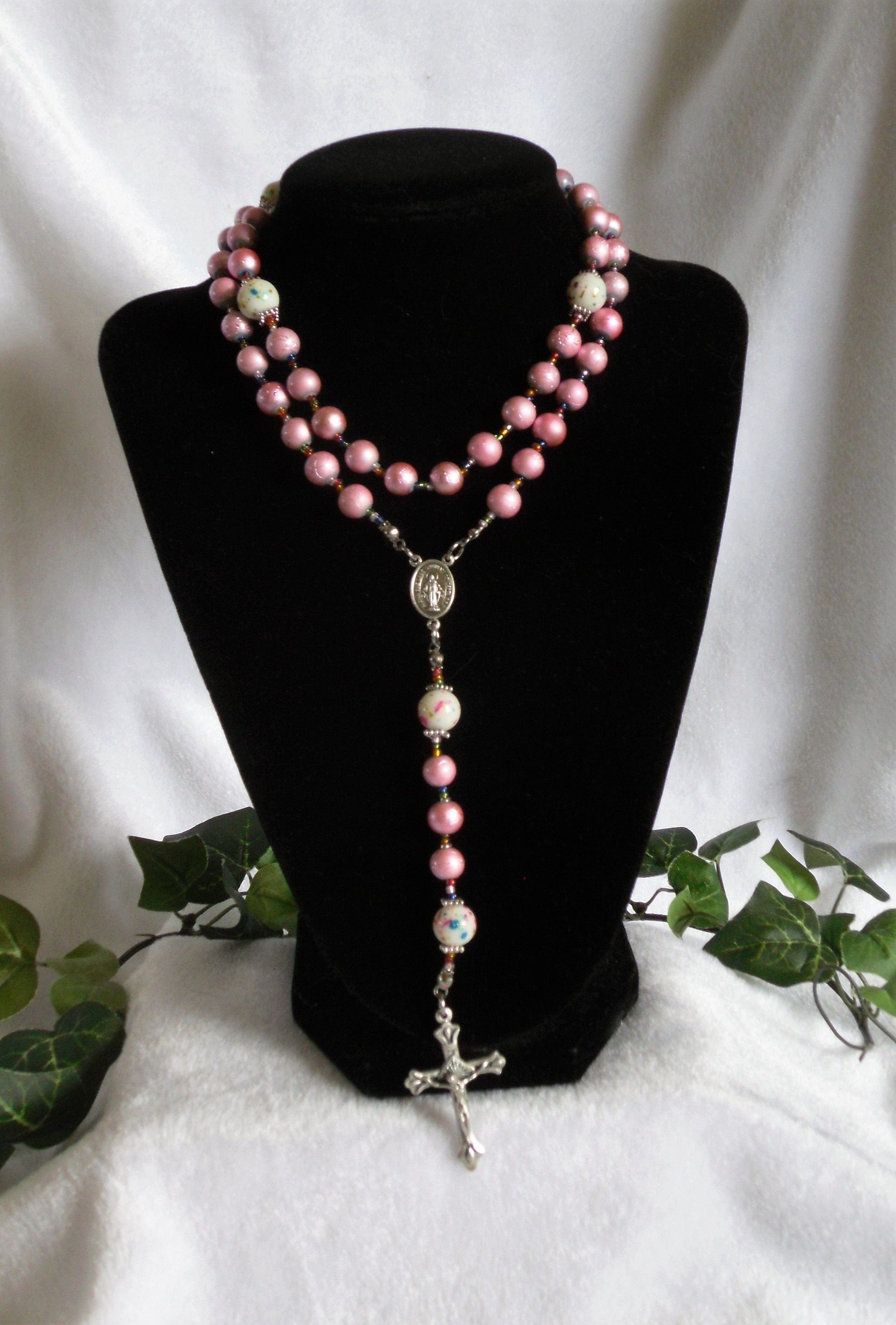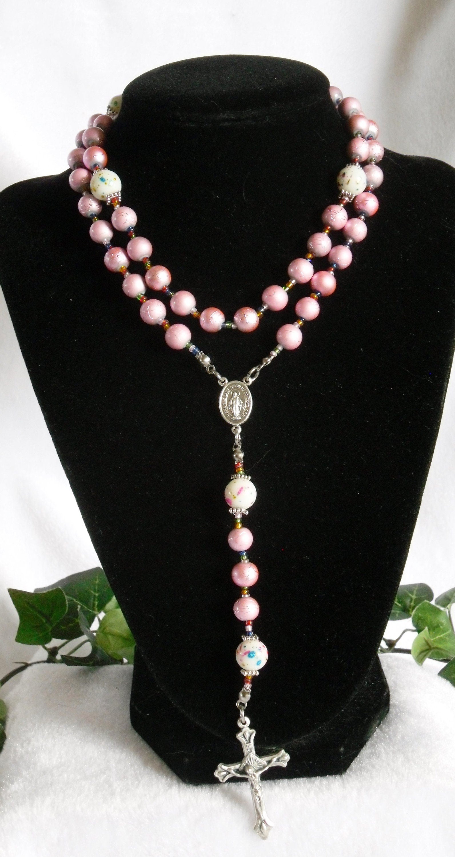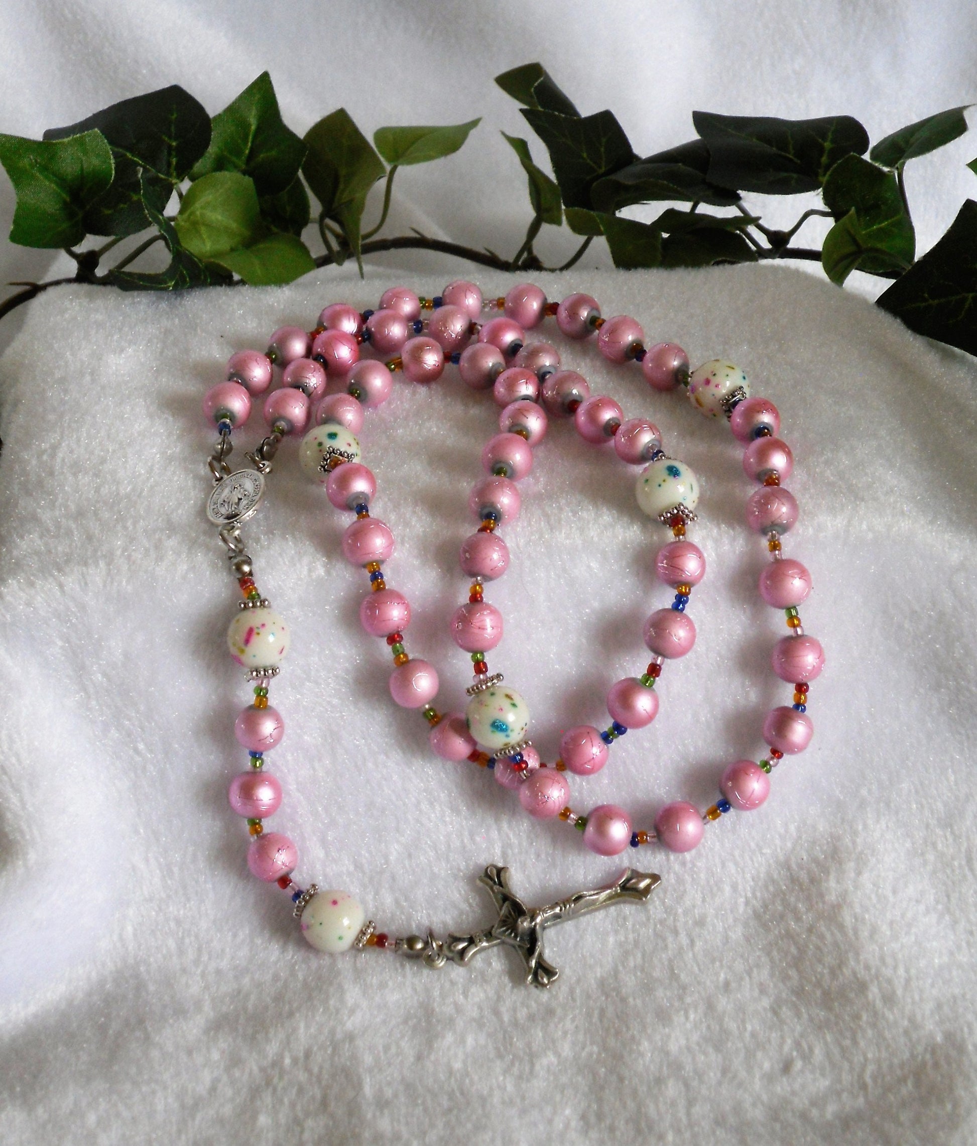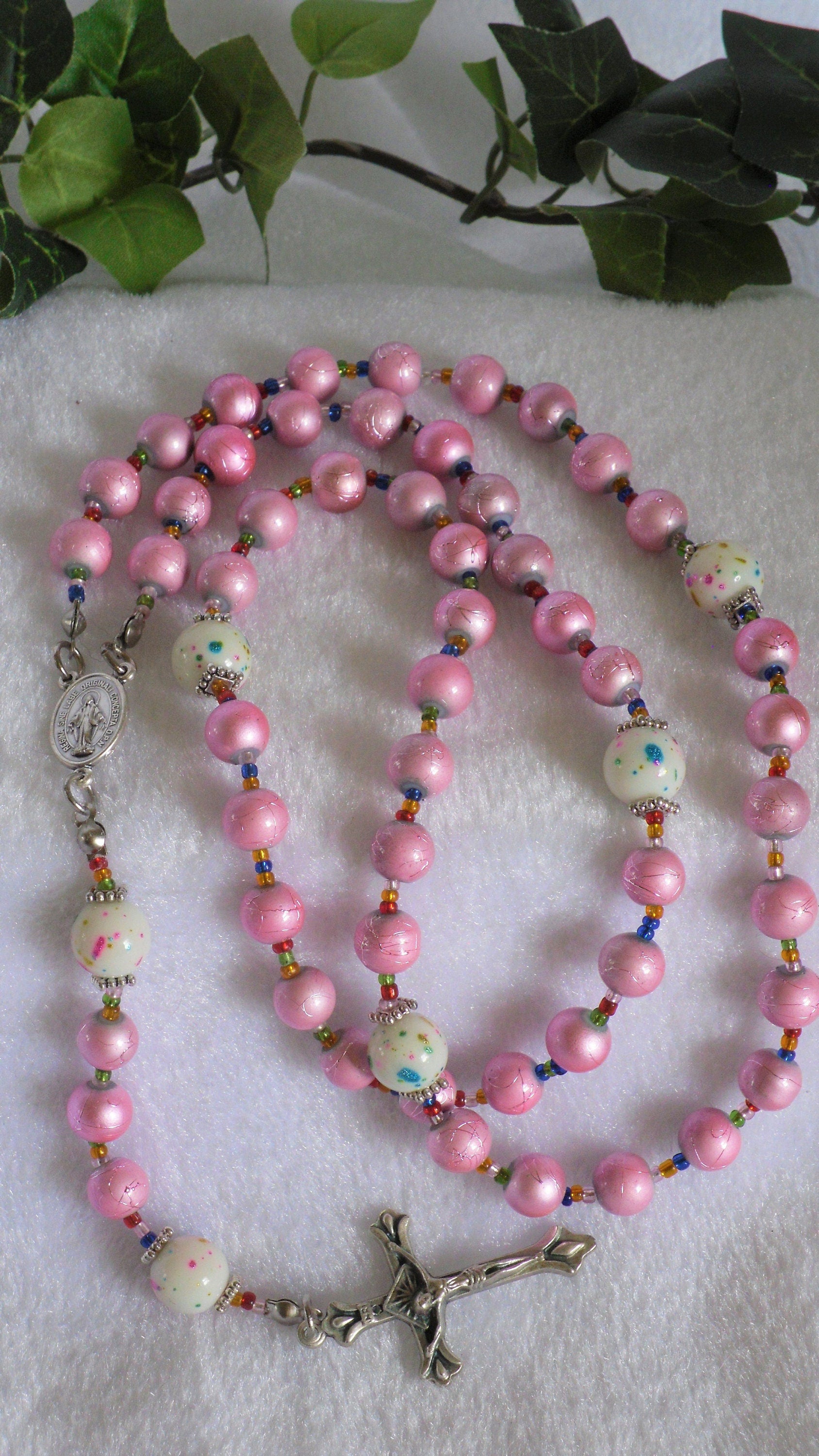 Each Ave has its own texture while keeping with the uniform pink of each decade. The Paters are white glass with metallic multi-colored confetti randomly splashed around that matches with the pink Aves while multi-colored glass seed bead spacers continue with the subtle splashes of color without being obnoxious. Silver tone Italian metal center and crucifix complete this piece.