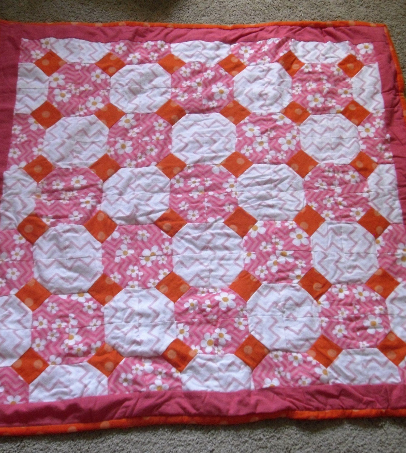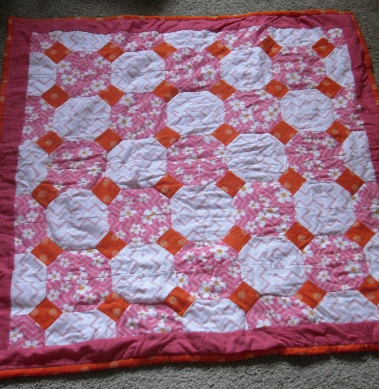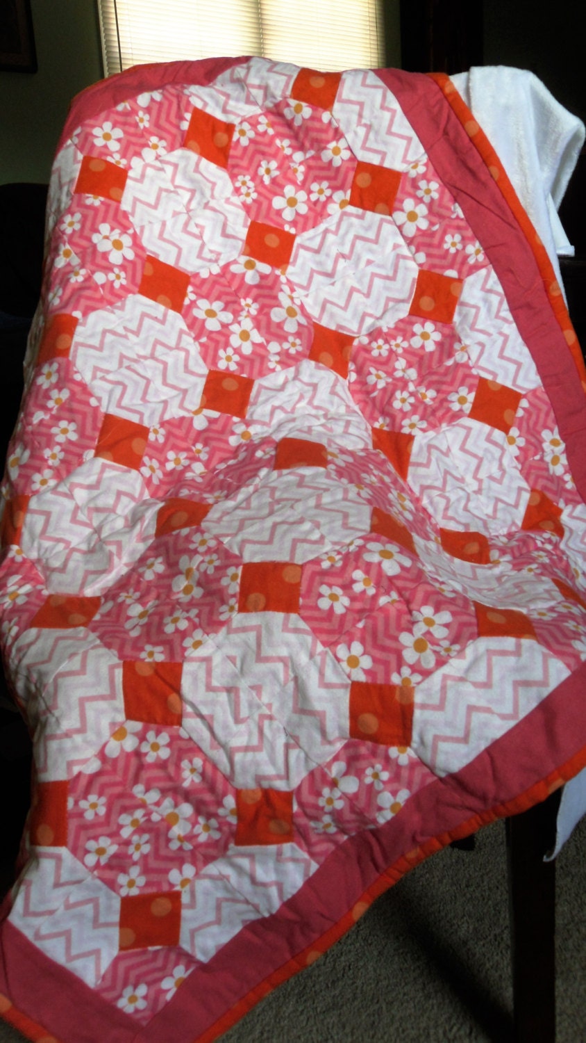 An updated take on the classic bowtie square with modern colors and patterns all ages will love. Pink chevrons, white daisies, and orange polka dots come together in this cozy and snuggly flannel quilt made to be loved. It was quilted by machine “in the ditch” style so as not to take away from the prints. Measures 37 inches by 38 inches.
