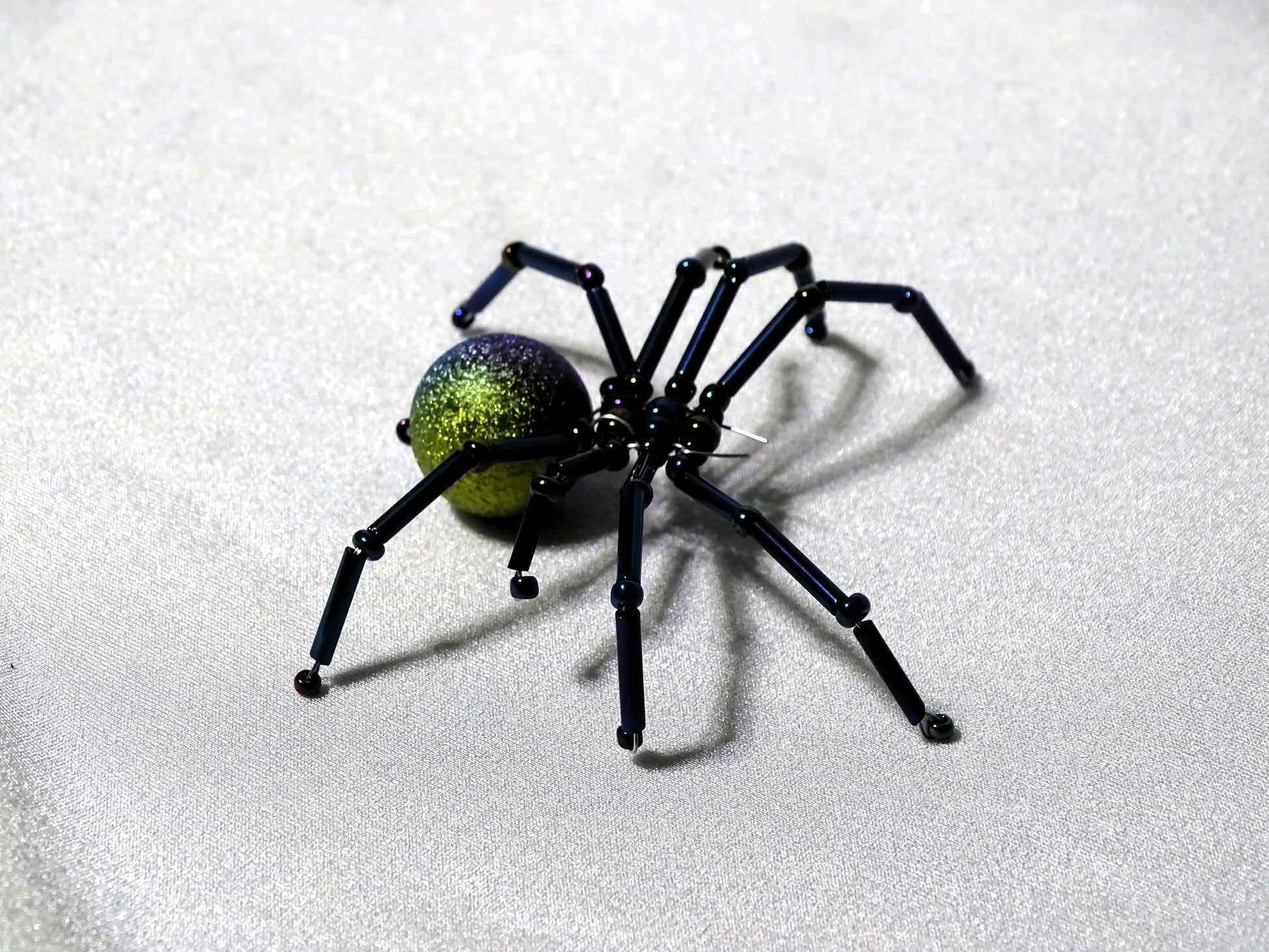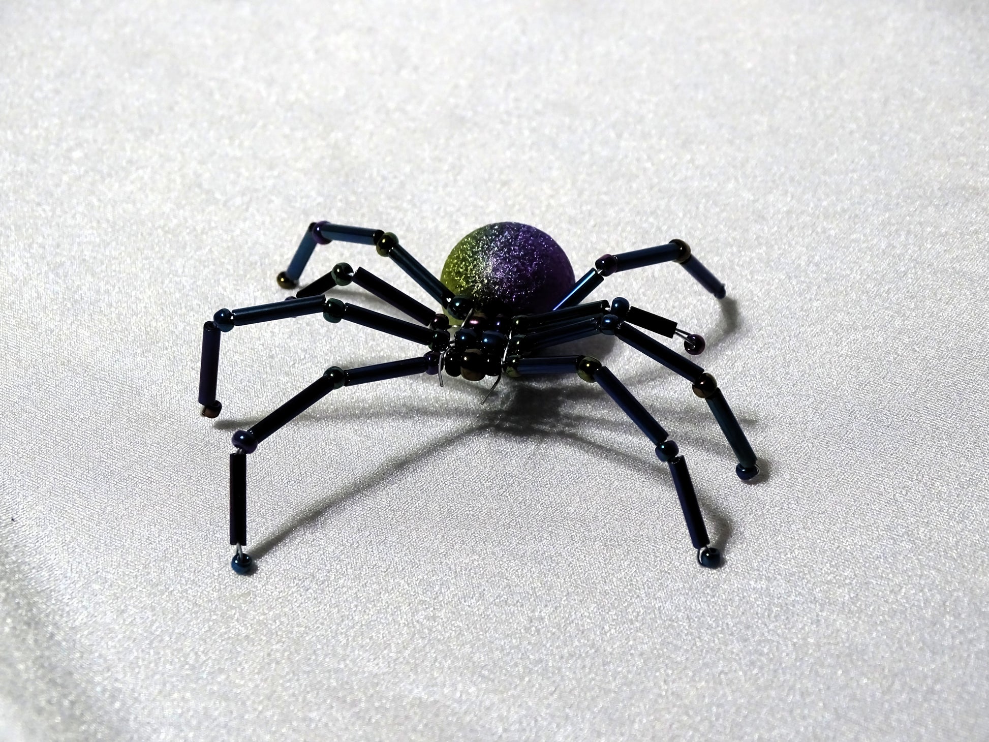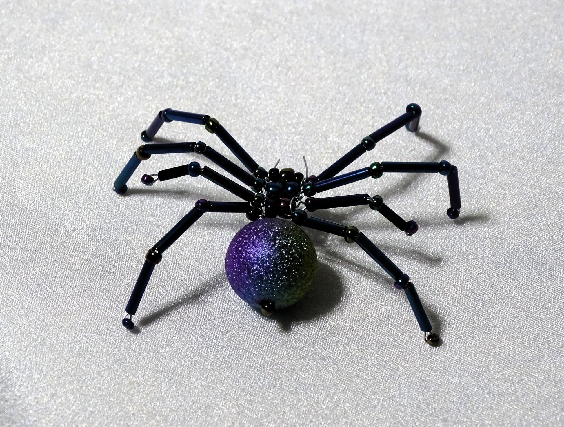Polychromatic is another word for multicolored, but it has a more sophisticated ring. The abdomen is a large, textured, acrylic bead featuring multiple colors splashed across it. The legs and body feature matching AB finished seed and bugle beads that complement the body in a surprisingly lightweight spider. Measures approximately 2 ½ inches wide depending oh how its posed, but exercise caution when posing as too much bending can break the wire inside.