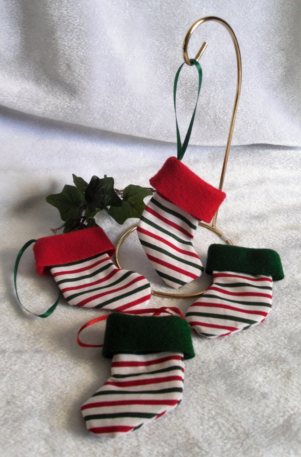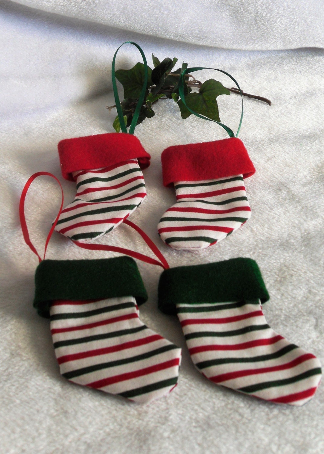 Festively simple stripes of red and green on white bring a little bit of the spirit of the elf to the tree. Each pair has either red felt cuffs with green ribbon or green felt cuffs with red ribbon to set each other off.