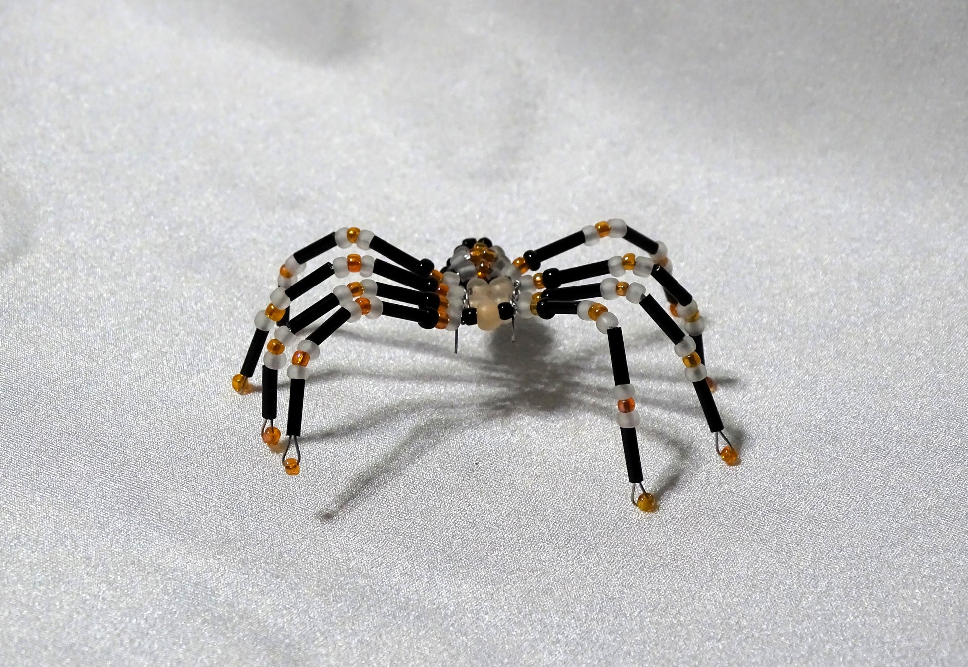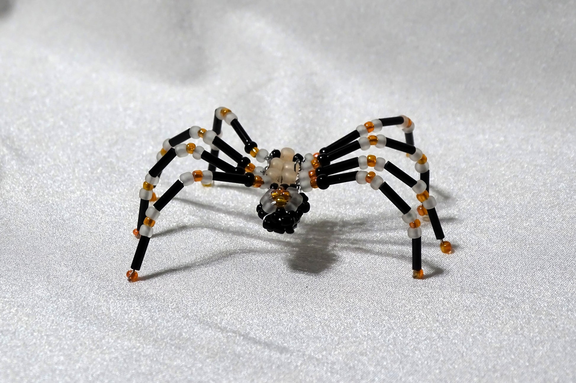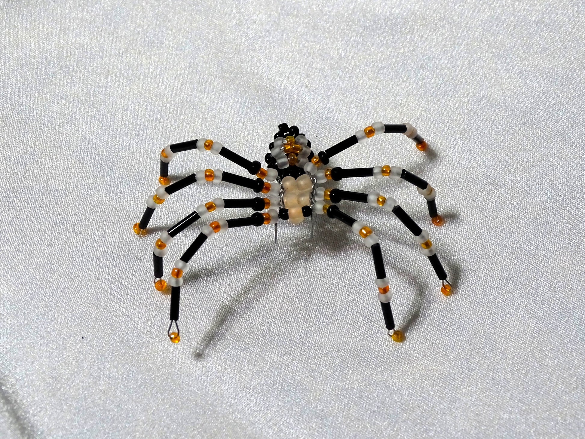 This little guy features the classic colors of Halloween with an emphasis on glowing in the dark. All of the soft white beads as well as the soft matte orange of the body will glow in the dark when sufficiently charged by light. Shiny black and AB finish orange complete the unique look of this one of a kind spider. Measures approximately 2 ½ inches wide depending on how it is posed, however, pose with caution as too much bending could break the wire inside.