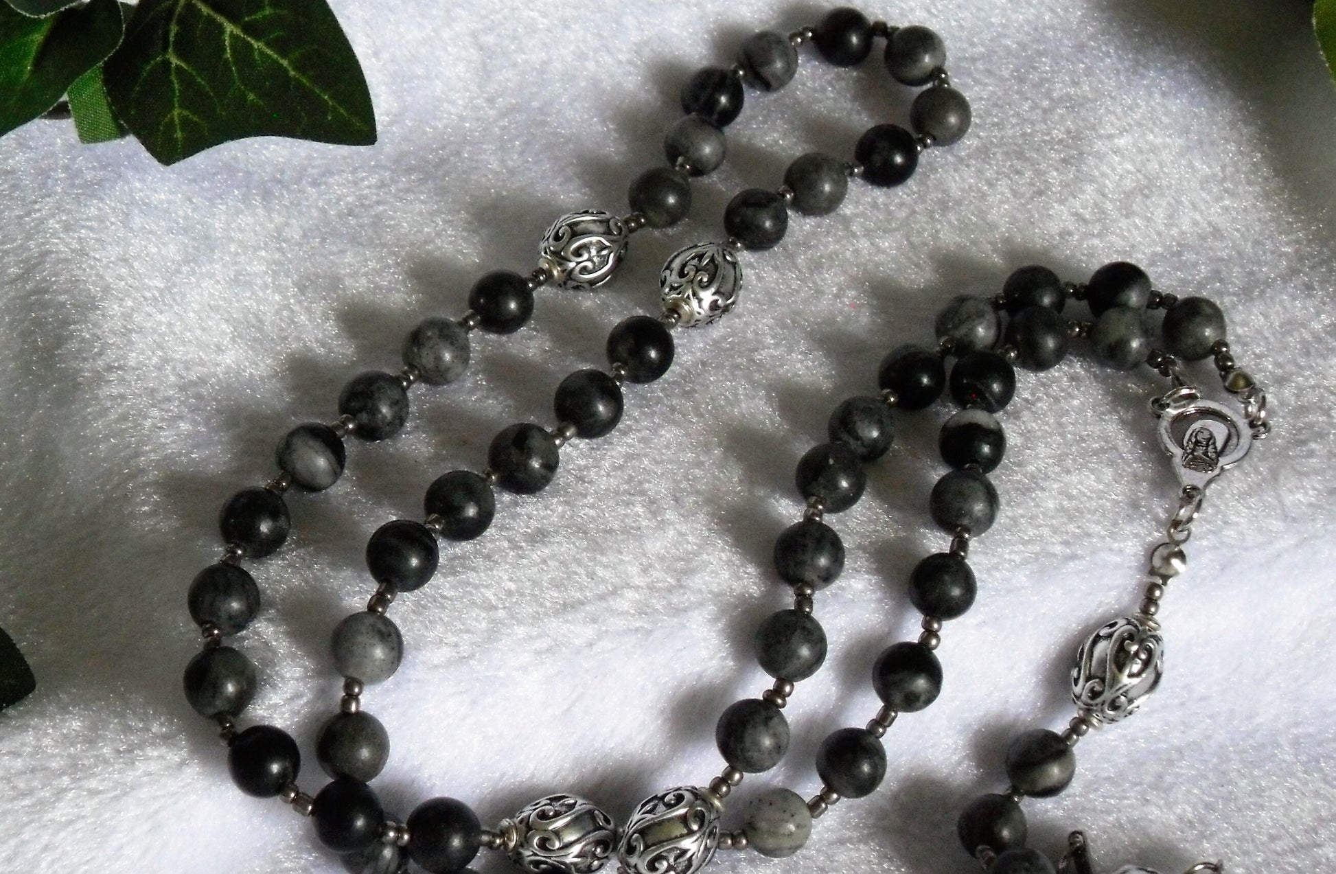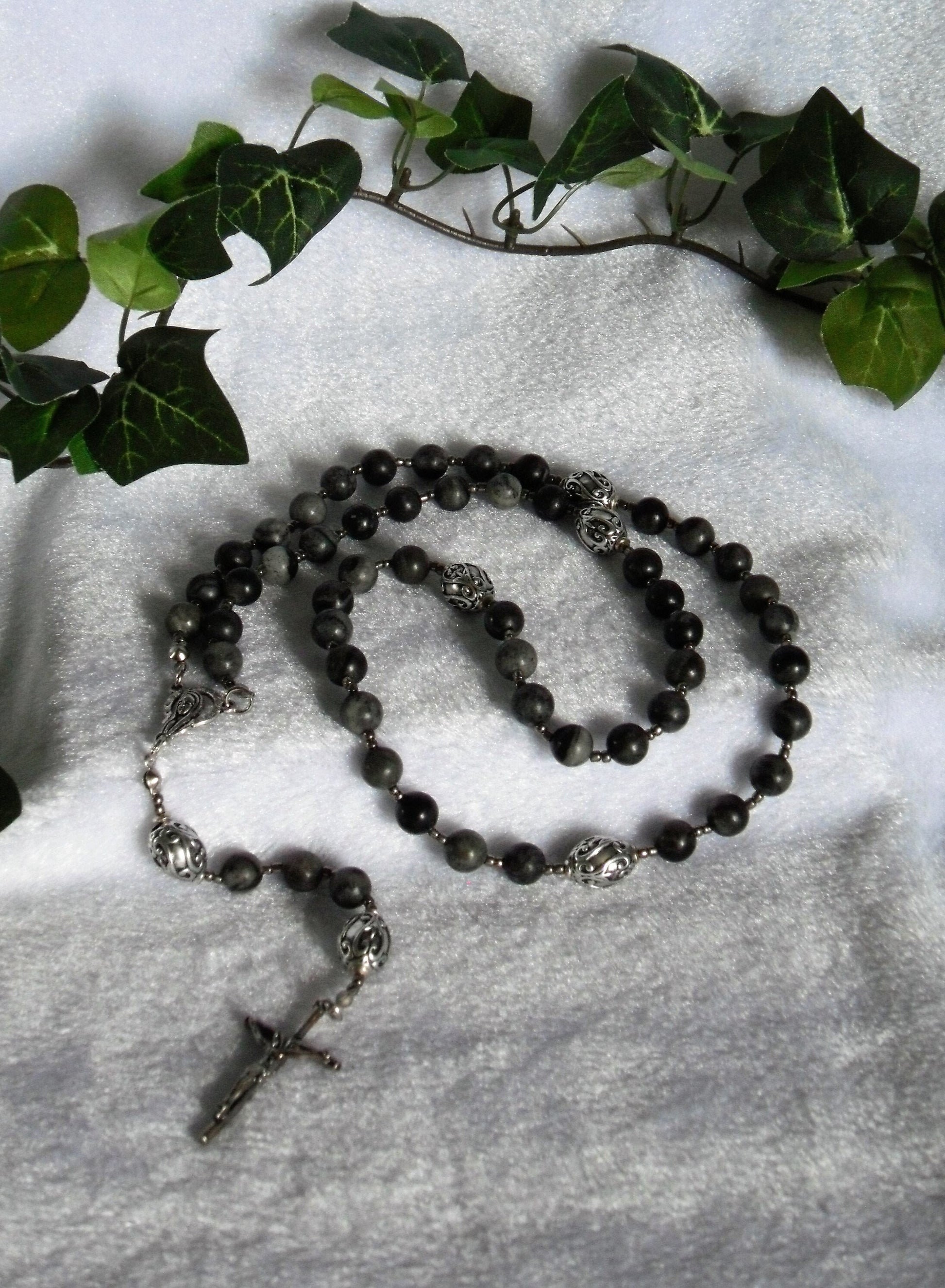 This rosary is made from beautiful Aves of black and grey wave jasper that compliment the silver plated Paters nicely. Silver glass seed beads create the movement and the piece is completed by the silver tone metal center and crucifix. The tones and the textures within the wave jasper never cease to amaze me, and hopefully they will be the same for you.