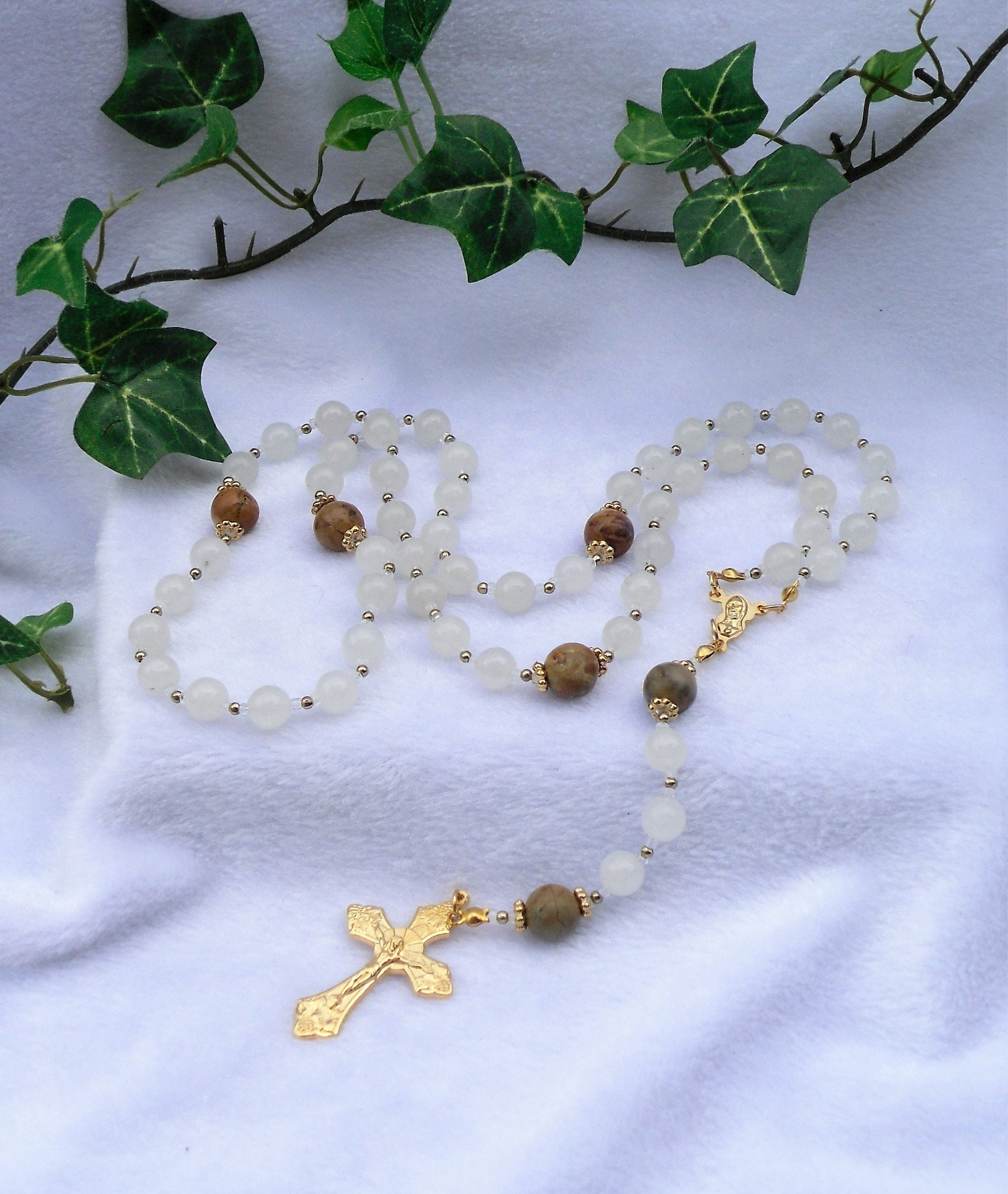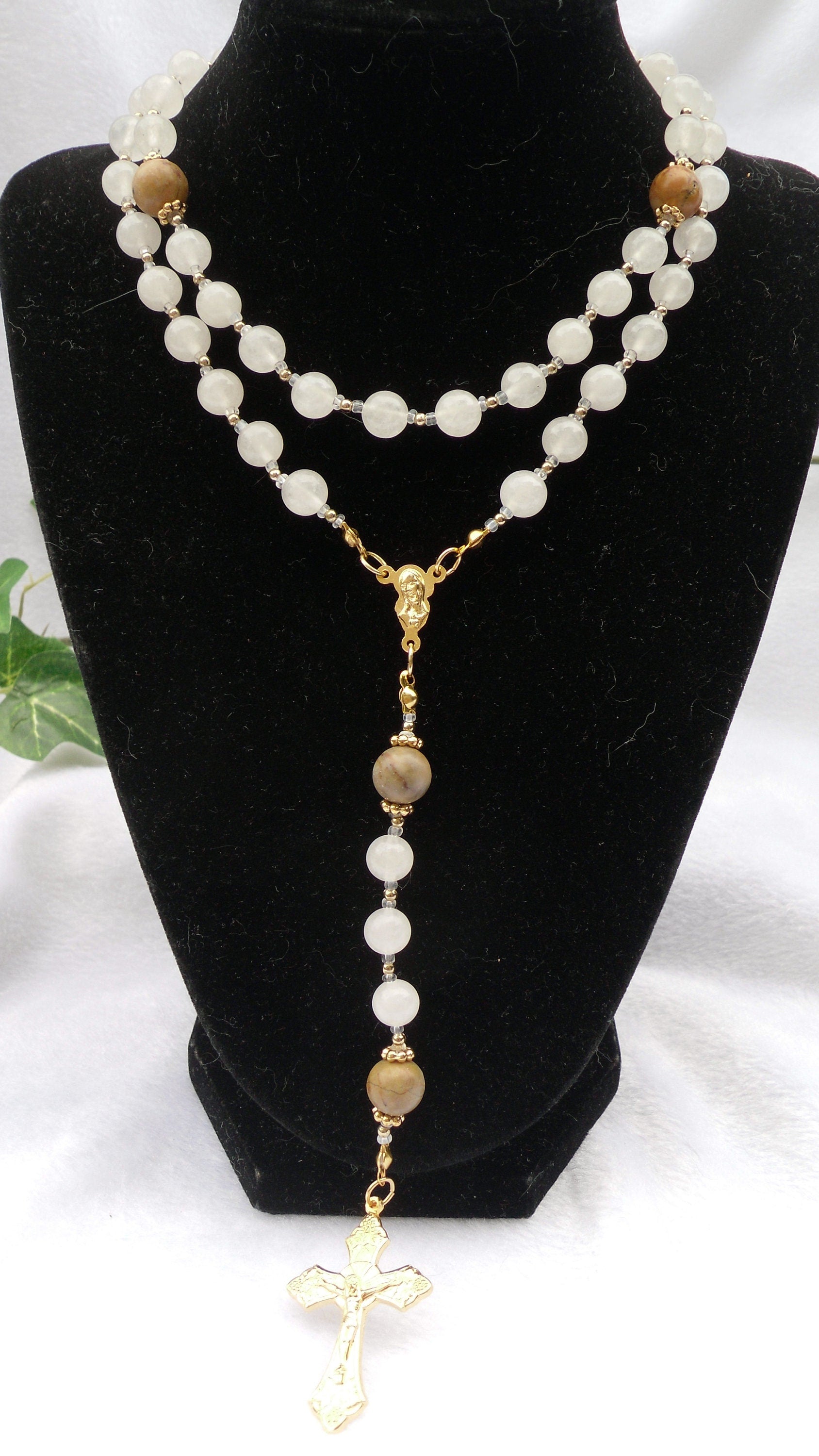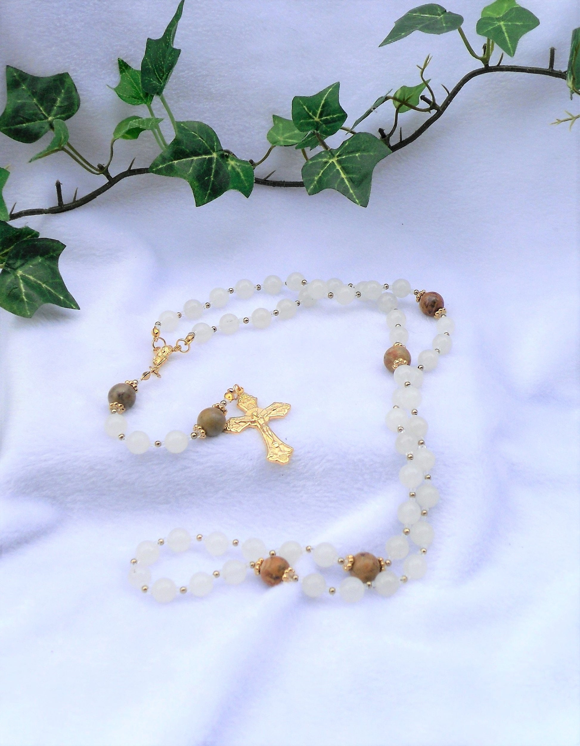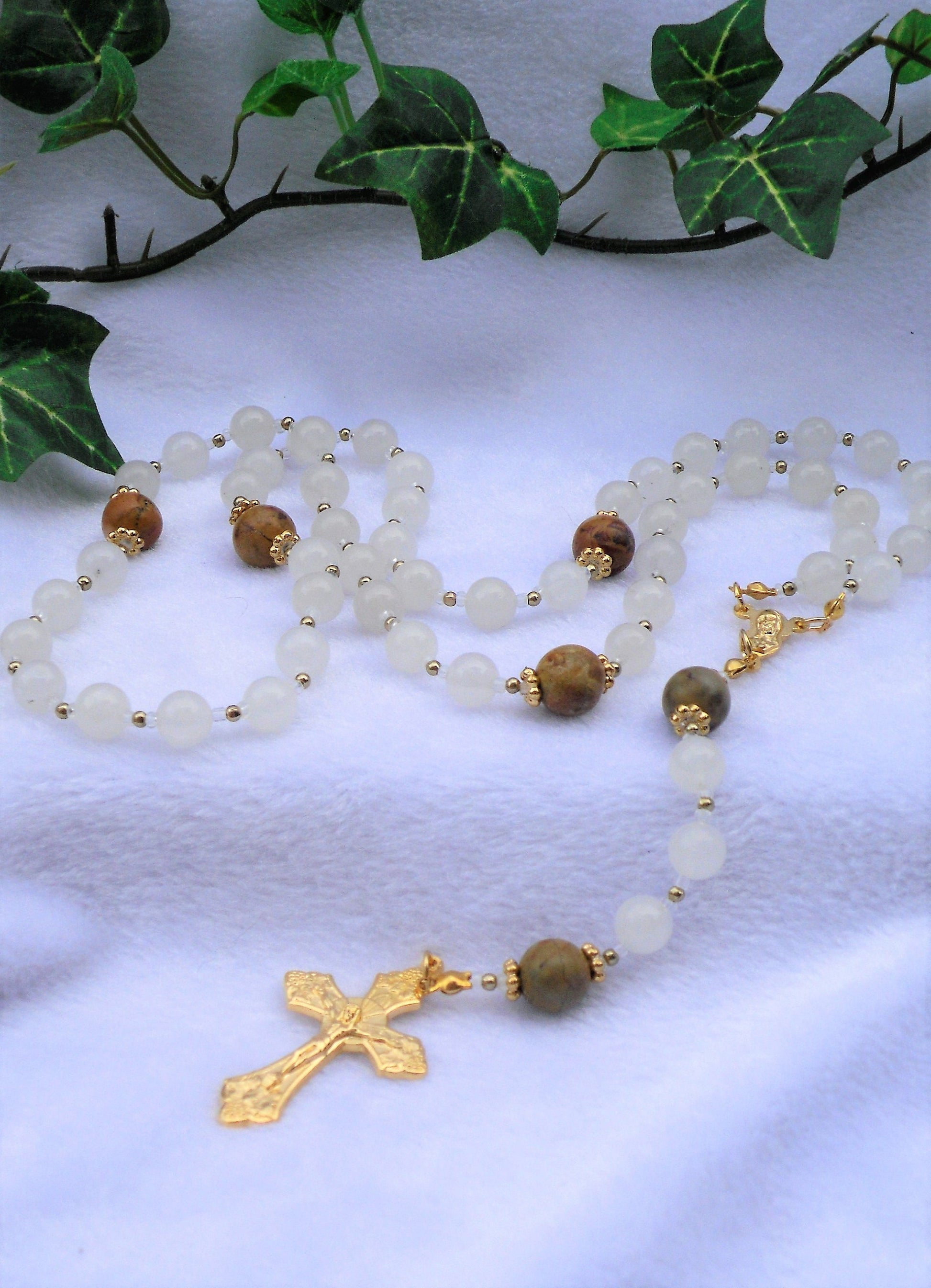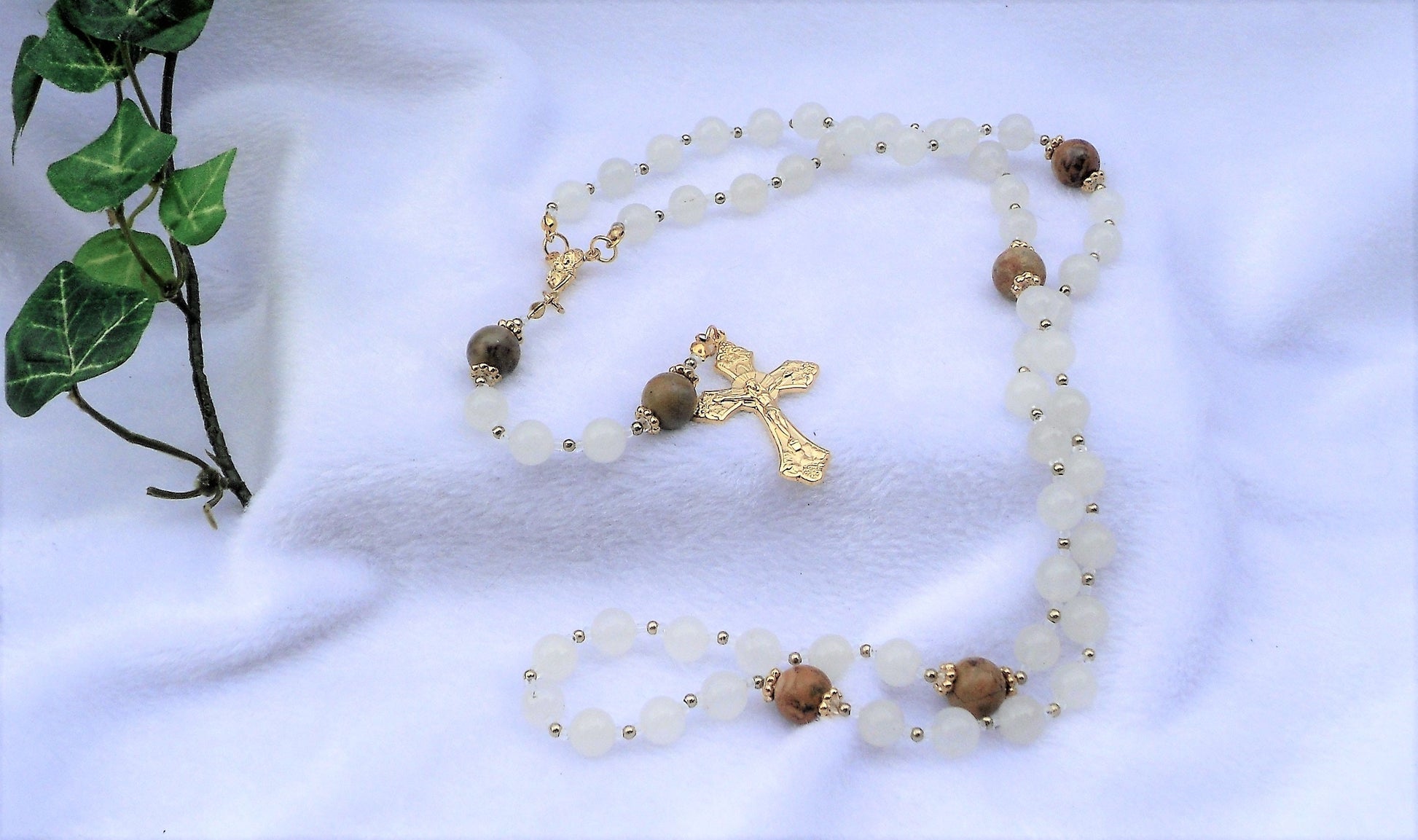 White quartzite stones comprise each decade of the Aves, each spaced with clear and gold glass seed beads that compliment the wonderfully unique Chinese jasper stone Paters accented with gold tone metal spacers. Gold tone metal Italian center and crucifix complete this beautiful, one of a kind rosary guaranteed to be cherished by whomever holds it.